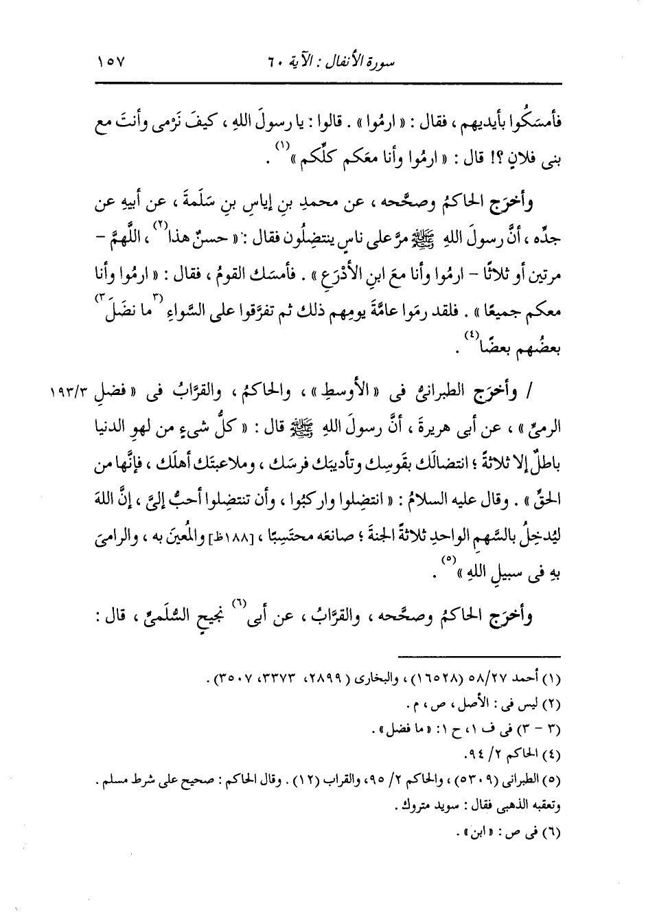 وأخرج البزار والحاكم وصححه عن أبي هريرة رضي الله عنه قال : خرج النَّبِيّ وقوم من أسلم يرمون فقال ارموا بني إسمعيل فإن أباكم كان راميا ارموا وأنا مع ابن الأدرع ، فأمسك القوم فسألهم فقالوا : يا رسول الله من كنت معه غلب ، قال : ارموا وأنا معكم كلكم.