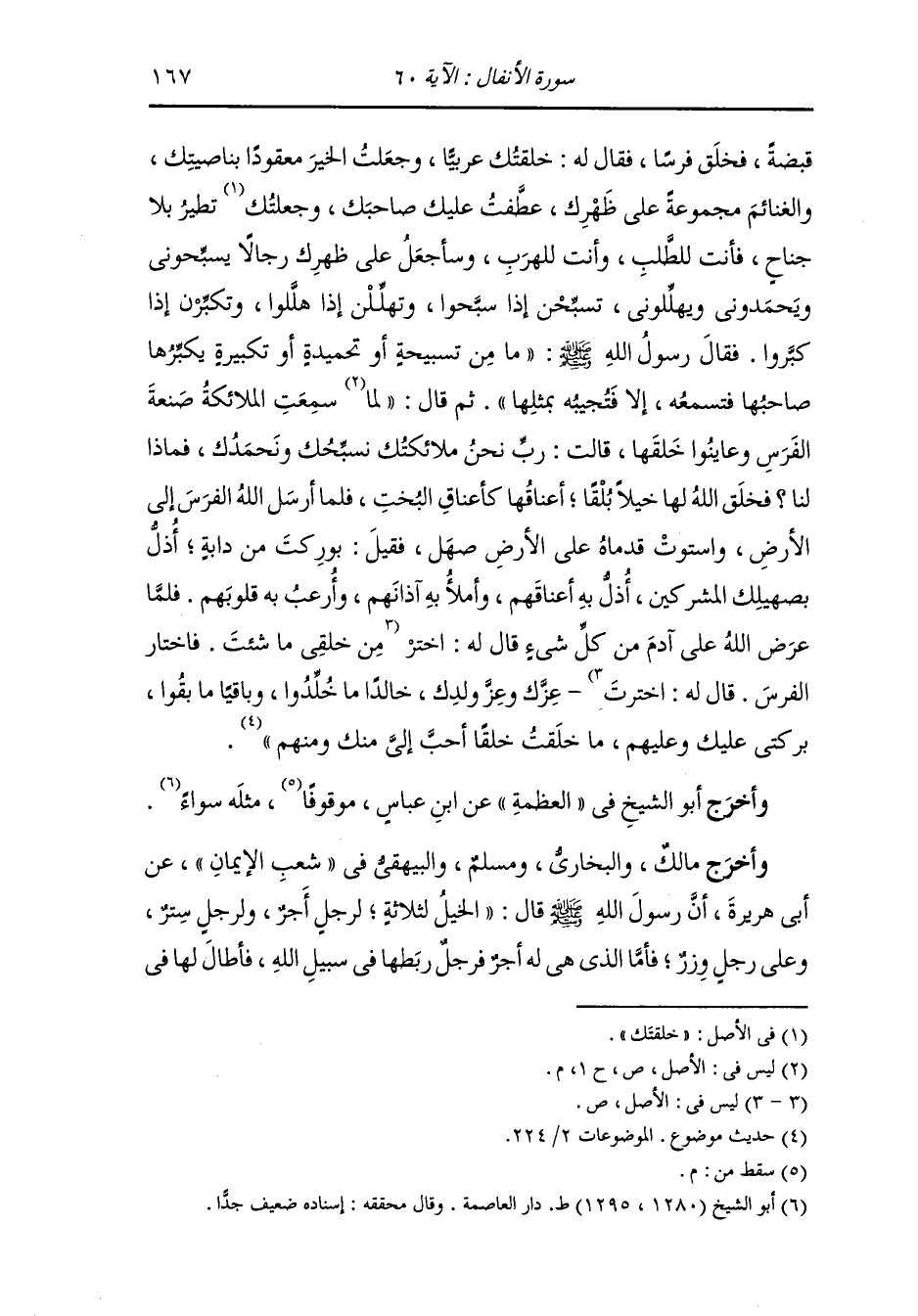 وأخرج الثعلبي عن علي رضي الله عنه قال : قال رسول الله صلى الله عليه وسلم لما أراد الله أن يخلق الخيل قال للريح الجنوب : إني خالق منك خلقا فأجعله عزا لأوليائي ومذلة على أعدائي وجمالا لأهل طاعتي فقالت الريح : اخلق فقبض منها