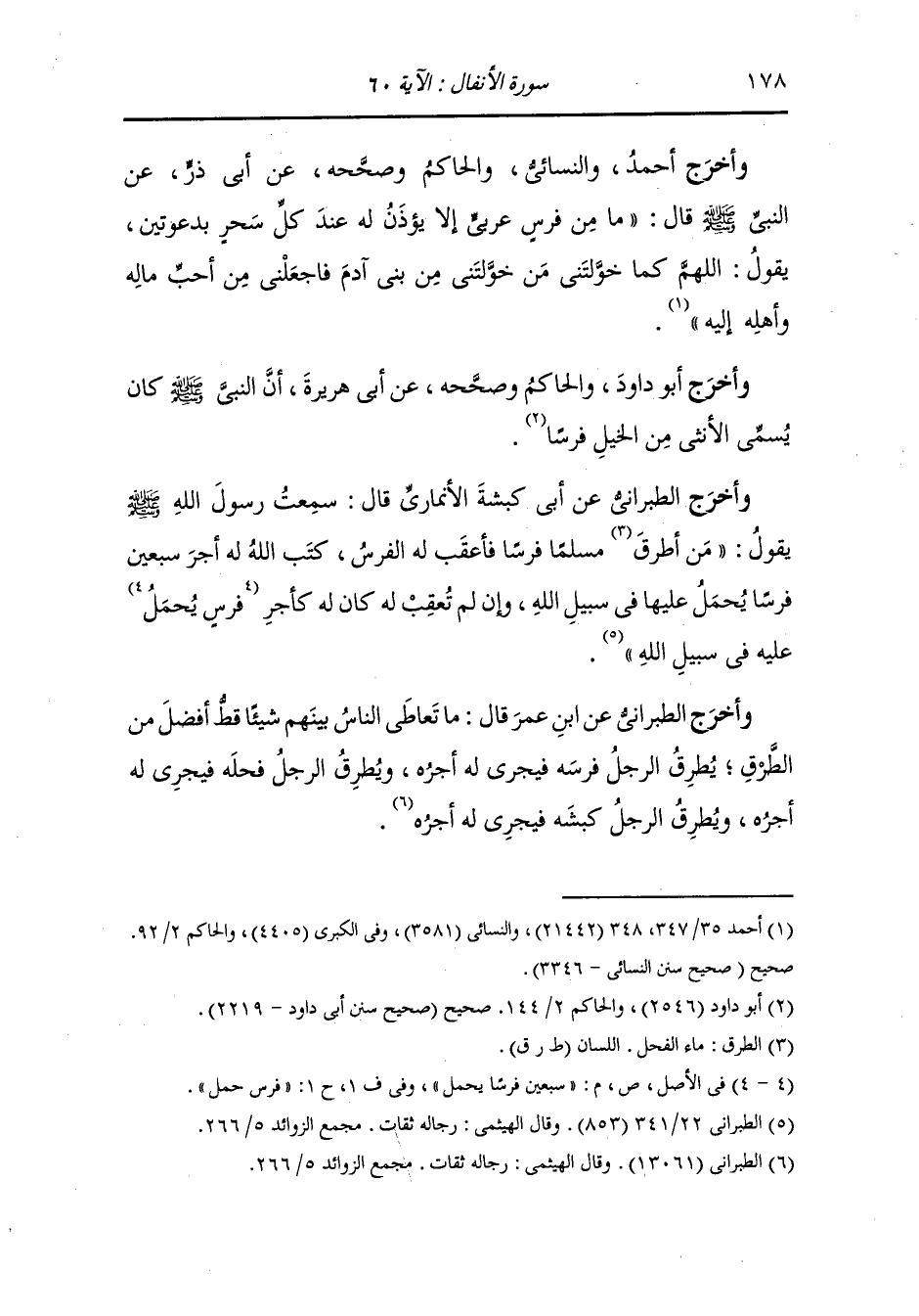 وأخرج البخاري والنسائي والحاكم وصححه والبيهقي عن أبي هريرة رضي الله عنه عن النَّبِيّ صلى الله عليه وسلم قال من احتبس فرسا في سبيل الله إيمانا بالله وتصديق موعود الله كان شبعه وريه وبوله حسنات في ميزانه يوم القيامة