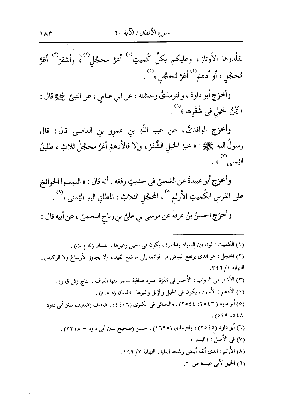 وأخرج ابن سعد وأبو داود والنسائي عن أبي وهب الجشمي رضي الله عنه قال : قال رسول الله صلى الله عليه وسلم ارتبطوا الخيل وامسحوا بنواصيها وأكنافها وقلدوها ولا
