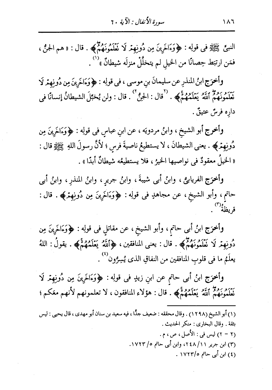 وأخرج سعد والحرث بن أبي أسامة وأبو يعلى ، وَابن المنذر ، وَابن أبي حاتم ، وَابن قانع في معجمه والطبراني وأبو الشيخ ، وَابن منده والروياني في مسنده ، وَابن مردويه ، وَابن عساكر عن يزيد بن عبد الله بن عريب عن أبيه عن جده عن النَّبِيّ صلى الله عليه وسلم قال : في قوله {وآخرين من دونهم لا تعلمونهم الله يعلمهم} قال : هم الجن ولا يخبل الشيطان إنسانا في داره فرس عتيق.