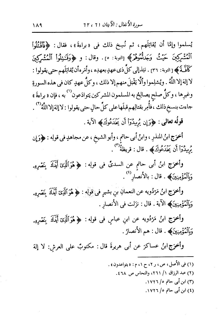 وأخرج أبو عبيد ، وَابن المنذر ، وَابن أبي حاتم ، وَابن مردويه عن ابن عباس رضي الله عنهما في قوله {وإن جنحوا للسلم فاجنح لها} قال : نسختها هذه الآية (قاتلوا الذين لا يؤمنون بالله ولا باليوم الآخر) (التوبة الآية 29) إلى قوله (صاغرون).
