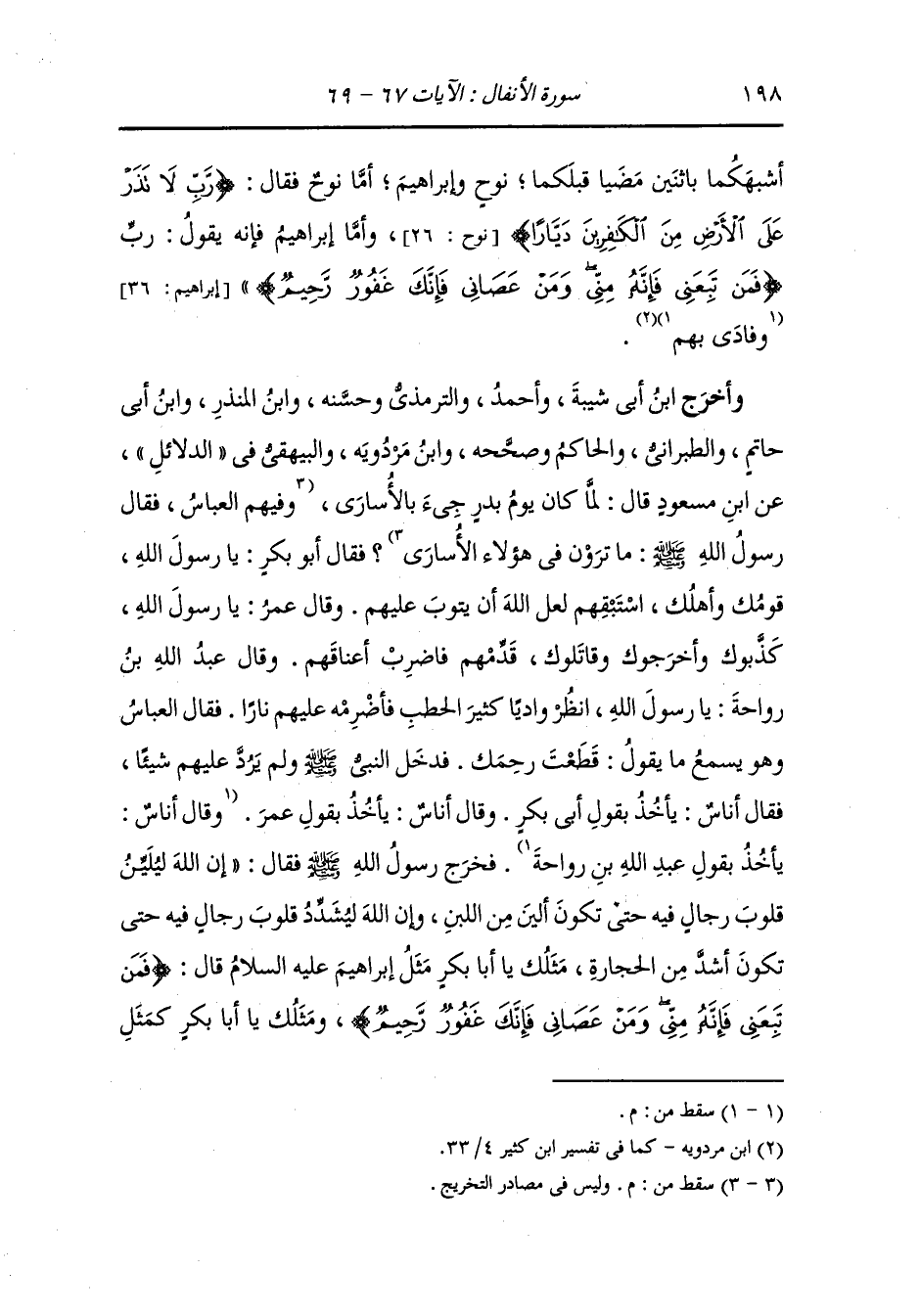 وأخرج ابن مردويه عن أبي هريرة رضي الله عنه في الآية قال استشار رسول الله صلى الله عليه وسلم أبا بكر رضي الله عنه فقال : يا رسول الله قد أعطاك الظفر ونصرك عليهم ففادهم فيكون عونا لأصحابك واستشار عمر رضي الله عنه فقال : يا رسول اللهأضرب أعناقهم ، فقال رسول الله صلى الله عليه وسلم : رحمكما الله ، ما