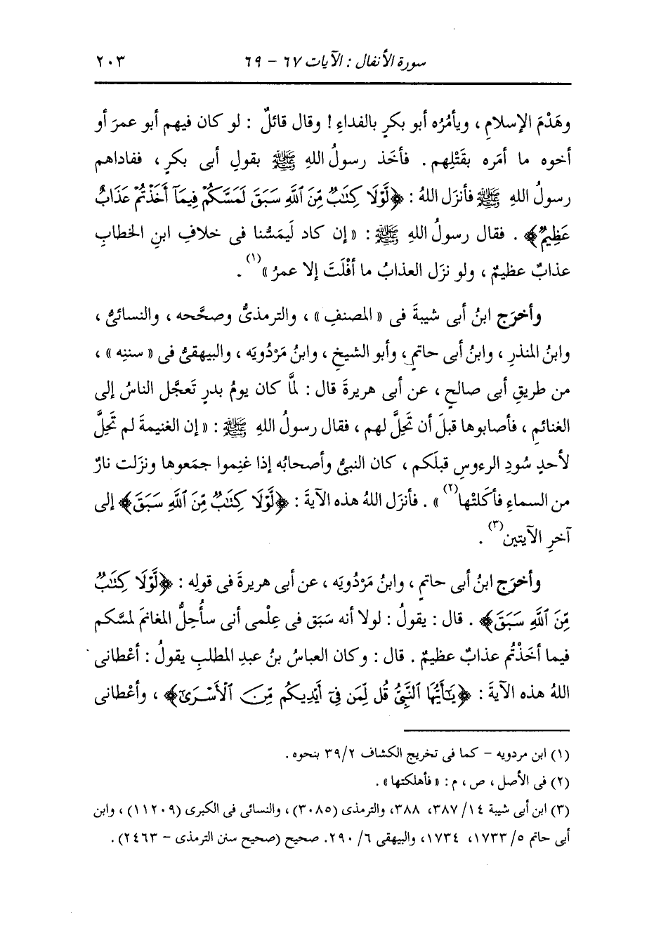 وأخرج الحاكم وصححه ، وَابن مردويه عن ابن عمر رضي الله عنهما قال لما أسر الأسارى يوم بدر أسر العباس فيمن أسر أسره رجل من الأنصار وقد وعدته الأنصار أن يقتلوه فبلغ ذلك النَّبِيّ صلى الله عليه وسلم فقال : لم أنم الليلة من أجل عمي العباس وقد زعمت الأنصار أنهم قاتلوه فقال له عمر : فآتيهم قال : نعم ، فأتى عمر رضي الله عنه الأنصار فقال لهم : أرسلوا العباس ، فقالوا : لا والله لا نرسله ، فقال لهم عمر رضي الله عنه : فإن كان لرسول الله صلى الله عليه وسلم رضا قالوا : فإن كان لرسول الله صلى الله عليه وسلم رضا فخذه ، فأخذه عمر رضي الله عنه فلما صار في يده قال له : يا عباس أسلم فوالله لأن تسلم أحب إلي من أن يسلم الخطاب وما ذاك إلا لما رأيت رسول الله صلى الله عليه وسلم يعجبه إسلامك ، قال : فاستشار رسول الله صلى الله عليه وسلم أبا بكر رضي الله عنه فقال أبو بكر رضي الله عنه : عشيرتك فأرسلهم فاستشار عمر رضي الله عنه فقال : أقتلهم ، ففاداهم رسول الله فأنزل الله {ما كان لنبي أن يكون له أسرى} الآية.
