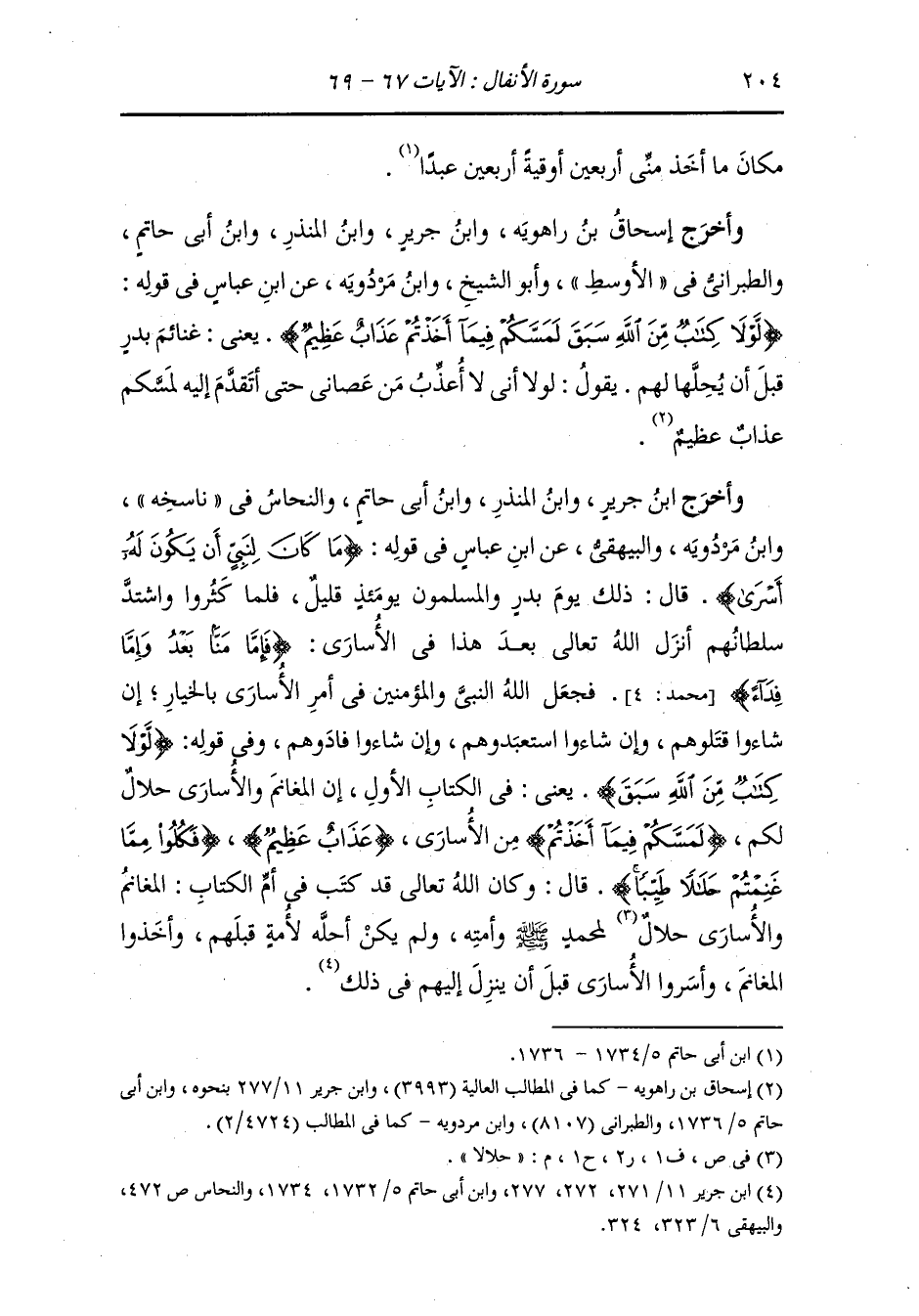 وأخرج ابن أبي حاتم ، وَابن مردويه عن أبي هريرة رضي الله عنه في قوله {لولا كتاب من الله سبق} قال : يقول لولا أنه سبق في علمي أني سأحل المغانم {لمسكم فيما أخذتم عذاب عظيم} قال : وكان العباس بن عبد المطلب يقول : أعطاني الله هذه الآية (يا أيها النَّبِيّ قل لمن في أيديكم من الأسارى) (الأنفال الآية 70) وأعطاني