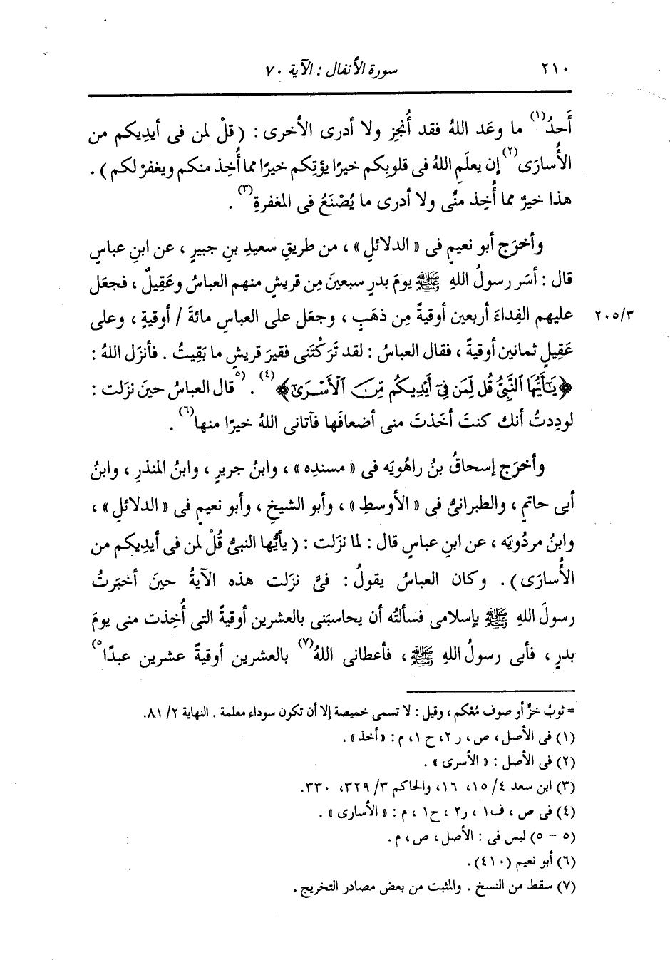 إن رأيتم أن تطلقوا لها أسيرها وقال العباس رضي الله عنه : إني كنت مسلما يا رسول الله ، قال : الله أعلم بإسلامك فإن تكن كما تقول فالله يجزيك فافد نفسك وابني أخويك نوفل بن الحارث وعقيل بن أبي طالب وحليفك عتبة بن عمر وقال : ما ذاك عندي يا رسول الله ، قال : فأين الذي دفعت أنت وأم الفضل فقلت لها : إن أصبت فإن هذا المال لبني ، فقال : والله يا رسول الله إن هذا لشيء ما علمه غيري وغيرها فاحسب لي ما أصبتم مني عشرين أوقية من مال كان معي فقال : أفعل ، ففدي نفسه