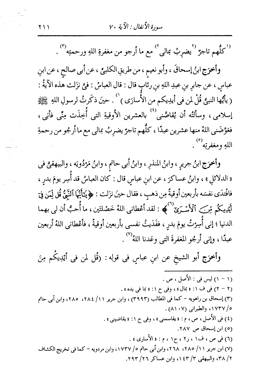 وَأخرَج إسحاق بن راهويه في مسنده " ، وَابن جَرِير ، وَابن المنذر ، وَابن أبي حاتم والطبراني في الأوسط " وأبو الشيخ وأبو نعيم في " الدلائل " ، وَابن مردويه عن ابن عباس قال : لما نزلت : (يأيها النَّبِيّ قل لمن في أيديكم من الأسارى) . وكان العباس يقول : في نزلت هذه الآية حين أخبرت رسول الله صلى الله عليه وسلم بإسلامي فسألته أن يحاسبني بالعشرين أوقية التي أخذت مني يوم بدر فأبى رسول الله صلى الله عليه وسلم فأعطاني الله بالعشرين أوقية عشرين عبدا