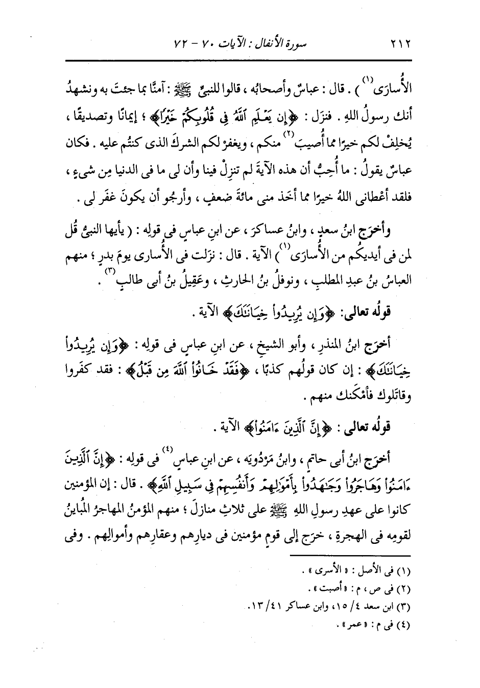 وَأخرَج ابن إسحاق وأبو نعيم من طريق الكلبي عن أبي صالح عن ابن عباس ، عَن جَابر بن عبدالله بن رئاب قال : قال العباس في نزلت هذه الآية : (يأيها النَّبِيّ قل لمن في أيديكم من الأسرى) . حين ذكرت لرسول الله إسلامي وسألته أن يقاسمني بالعشرين أوقية التي أخذت مني فعوضني الله منها عشرين عبدا كلهم تاجر يضرب بمالي مع ما أرجو من رحمة الله ومغفرته.