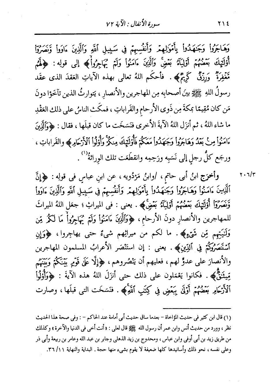 قال : كانوا يتوارثون بينهم إذا توفي المؤمن المهاجر بالولاية في الدين وكان الذي آمن ولم يهاجر لا يرث من أجل أنه لم يهاجر ولم ينصر فبؤأ الله المؤمنين المهاجرين من ميراثهم وهي الولاية التي قال الله {ما لكم من ولايتهم من شيء حتى يهاجروا وإن استنصروكم في الدين فعليكم النصر إلا على قوم بينكم وبينهم ميثاق} وكان حقا على المؤمنين الذين آووا ونصروا إذا استنصروهم في الدين أن ينصروهم إن قوتلوا إلا أن يستنصروا على قوم بينهم وبين النَّبِيّ صلى الله عليه وسلم ميثاق ولا نصر لهم عليهم إلا على العدو الذي لا ميثاق لهم ثم أنزل الله تعالى بعد ذلك : إن ألحق كل ذي رحم برحمه من المؤمنين الذين آمنوا ولم يهاجروا فجعل لكل إنسان من المؤمنين نصيبا مفروضا لقوله {وأولو الأرحام بعضهم أولى ببعض في كتاب الله إن الله بكل شيء عليم} الأنفال الآية 75.