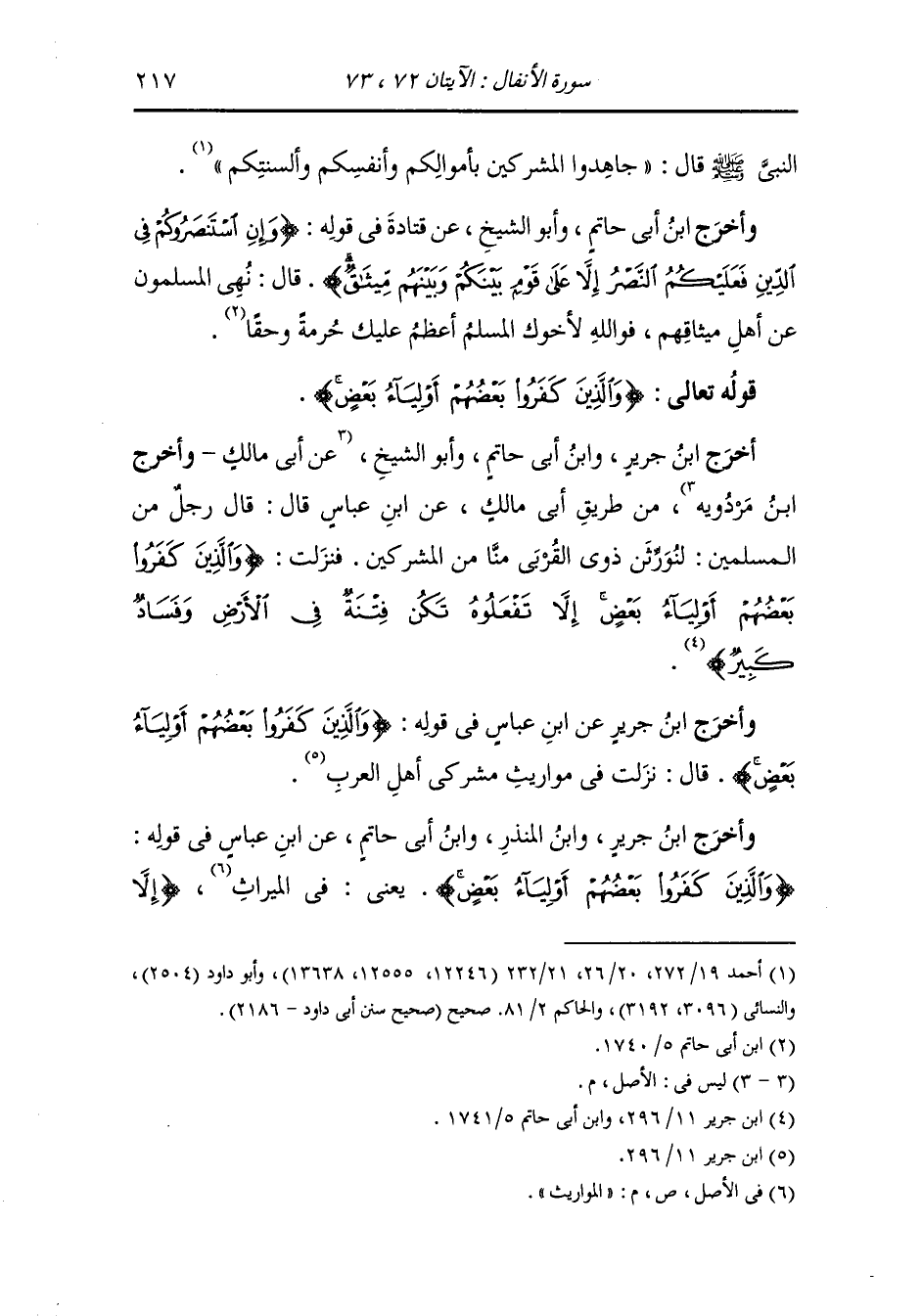 شيئا حتى نسخ ذلك بعد في سورة الأحزاب (وأولو الأرحام بعضهم أولى ببعض في كتاب الله من المؤمنين والمهاجرين) فخلط الله بعضهم ببعض وصارت المواريث بالملل.
