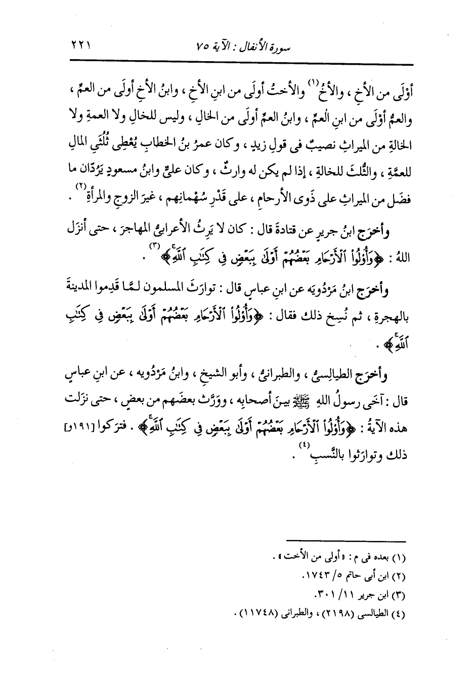وأخرج ابن أبي حاتم عن سعيد بن جبير رضي الله عنه في قوله {وأولو الأرحام بعضهم أولى ببعض في كتاب الله} قال : نسخت هذه الآية ما كان قبلها من مواريث العقد والحلف والمواريث بالهجرة وصارت لذوي الأرحام قال : والابن