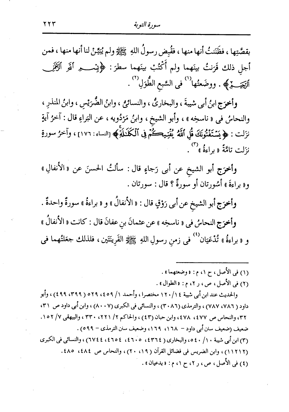 وأخرج ابن أبي شيبة وأحمد وأبو داود والترمذي وحسنه والنسائي ، وَابن أبي داود في المصاحف ، وَابن المنذر والنحاس في ناسخه ، وَابن حبان وأبو الشيخ والحاكم وصححه ، وَابن مردويه والبيهقي في الدلائل عن ابن عباس رضي الله عنهما قال : قلت لعثمان بن عفان رضي الله عنه : ما حملكم أن عمدتم إلى الأنفال وهي من المثاني وإلى براءة وهي من المئين فقرنتم بينهما ولم تكتبوا سطر بسم الله الرحمن الرحيم ووضعتموها في السبع الطوال ما حملكم على ذلك فقال عثمان رضي الله عنه : كان رسول الله صلى الله عليه وسلم مما يأتي عليه الزمان وهو ينزل عليه السور ذوات العدد فكان إذا نزل عليه الشيء دعا بعض من كان يكتب فيقول ضعوا هؤلاء الآيات في السورة التي يذكر فيها كذا وكذا وكانت الأنفال من أوائل ما نزل بالمدينة وكانت براءة من آخر القرآن نزولا وكانت قصتها شبيهة