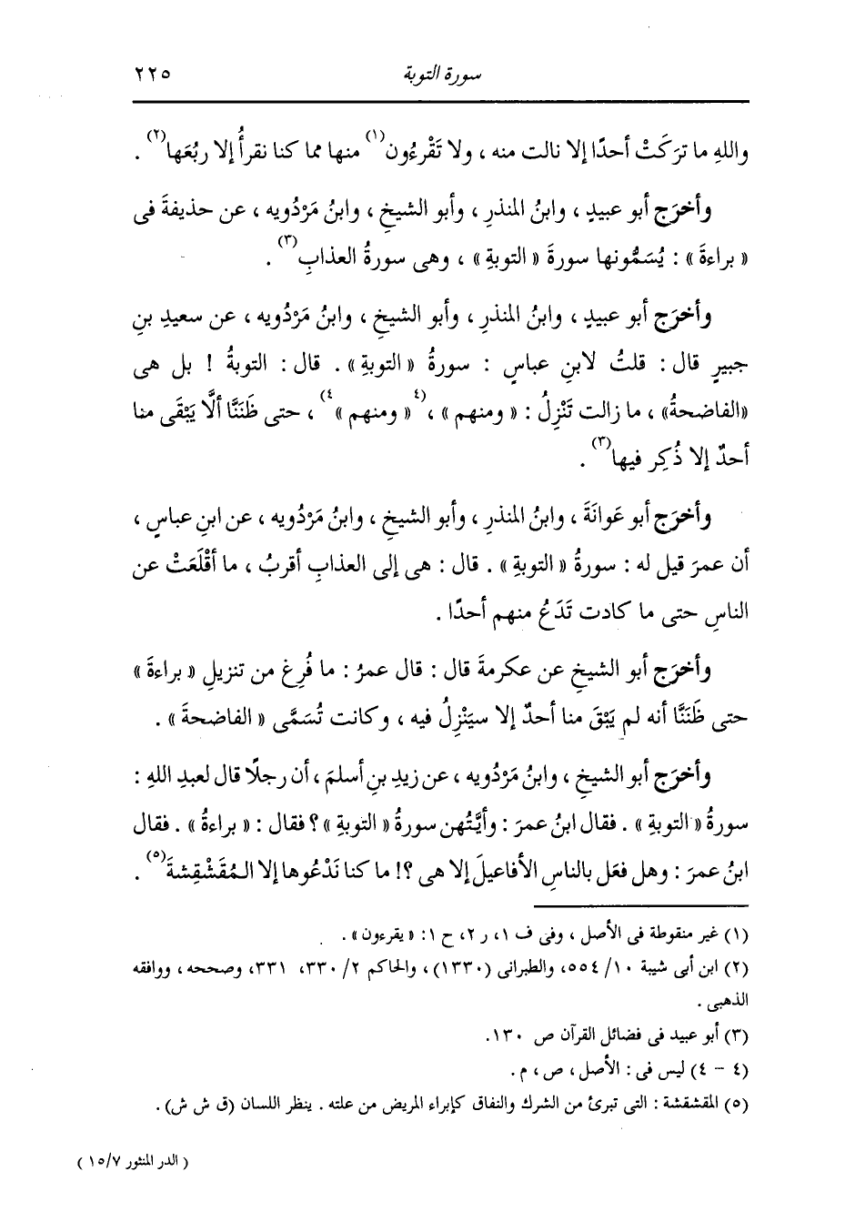 وأخرج ابن أبي شيبة والطبراني في الأوسط وأبو الشيخ والحاكم ، وَابن مردويه عن حذيفة رضي الله عنه قال : التي تسمون سورة التوبة هي سورة العذاب