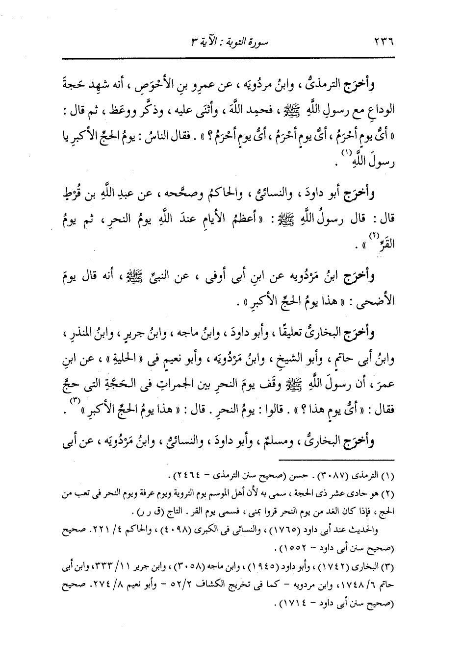 وأخرج الترمذي ، وَابن المنذر ، وَابن أبي حاتم ، وَابن مردويه عن علي رضي الله عنه قال : سألت رسول الله صلى الله عليه وسلم عن يوم الحج الأكبر فقال يوم النحر.