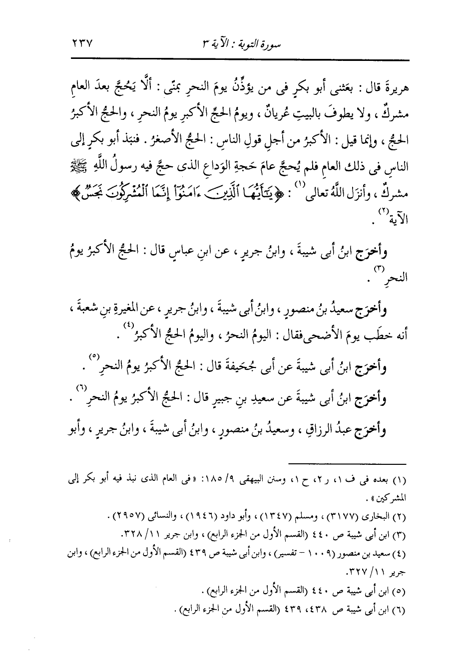 وأخرج البخاري تعليقا وأبو داود ، وَابن ماجة ، وَابن جَرِير ، وَابن المنذر ، وَابن أبي حاتم وأبو الشيخ ، وَابن مردويه وأبو نعيم في الحلية عن ابن عمر رضي الله عنهما أن رسول الله صلى الله عليه وسلم وقف يوم النحر بين الجمرات في الحجة التي حجها فقال : أي يوم هذا قالوا : يوم النحر ، قال : هذا يوم الحج الأكبر.