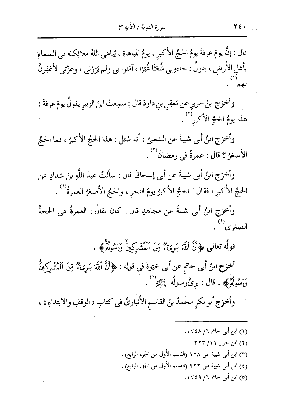 وأخرج ابن جرير عن أبي الصهباء البكري قال : سألت علي بن أبي طالب رضي الله عنه عن يوم الحج الأكبر فقال : يوم عرفة.