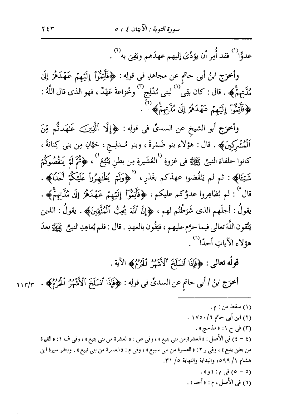 وَأخرَج ابن أبي حاتم عن ابن عباس رضي الله عنهما في قوله {إلا الذين عاهدتم من المشركين} قال : هم مشركو قريش الذين عاهدهم نبي الله زمن الحديبية وكان بقي من مدتهم أربعة اشهر بعد يوم النحر فأمر الله نبيه أن يوفي لهم بعهدهم هذا إلى مدتهم.