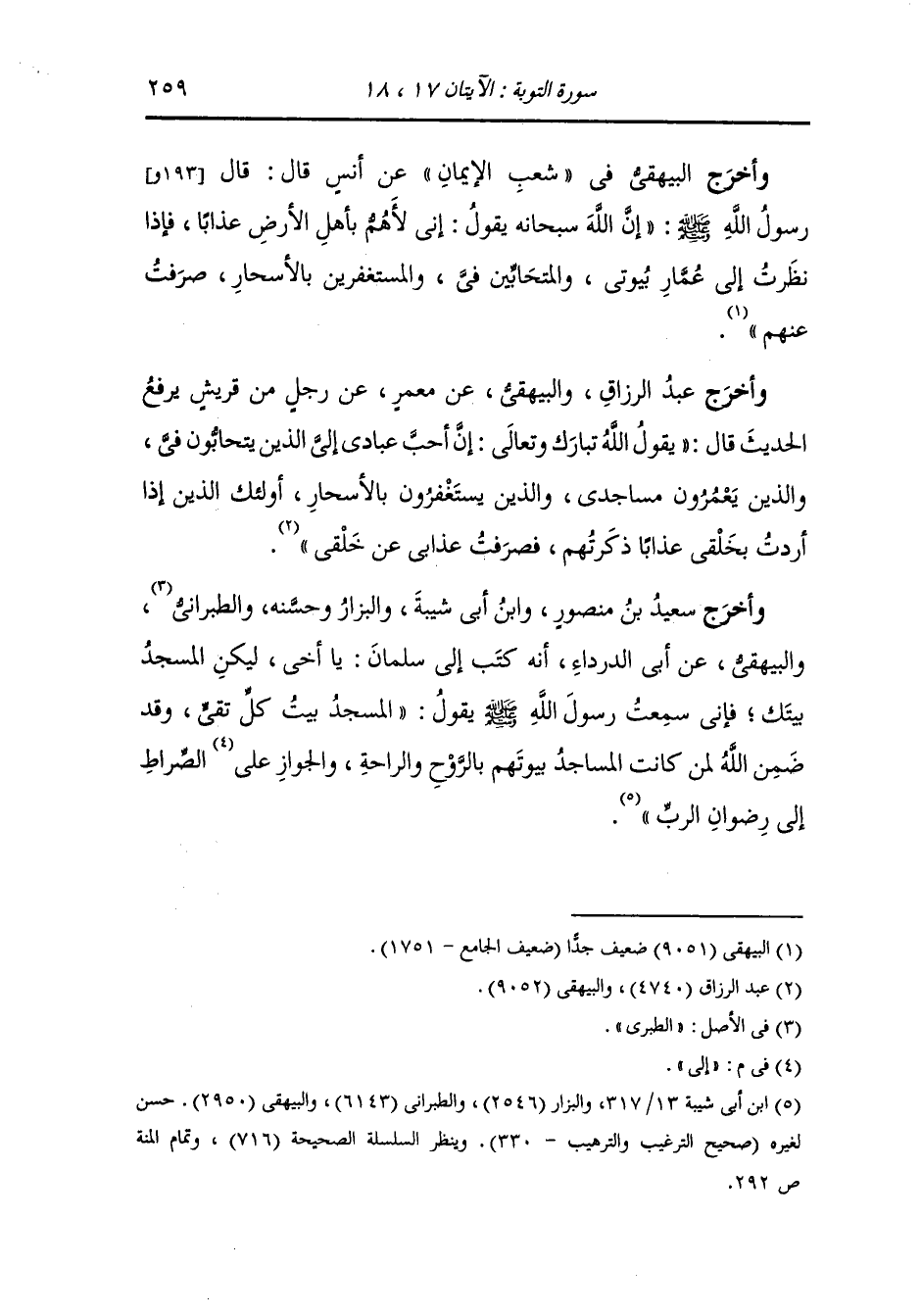 وأخرج أحمد ، وعَبد بن حُمَيد والدارمي والترمذي وحسنه ، وَابن ماجة ، وَابن المنذر ، وَابن أبي حاتم ، وَابن خزيمة ، وَابن حبان وأبو الشيخ والحاكم وصححه ، وَابن مردويه والبيهقي في "سُنَنِه" عن أبي سعيد الخدري رضي الله عنه قال : قال رسول الله صلى الله عليه وسلم إذا رأيتم الرجل يعتاد المسجد فاشهدوا له بالإيمان قال الله {إنما يعمر مساجد الله من آمن بالله واليوم الآخر}.