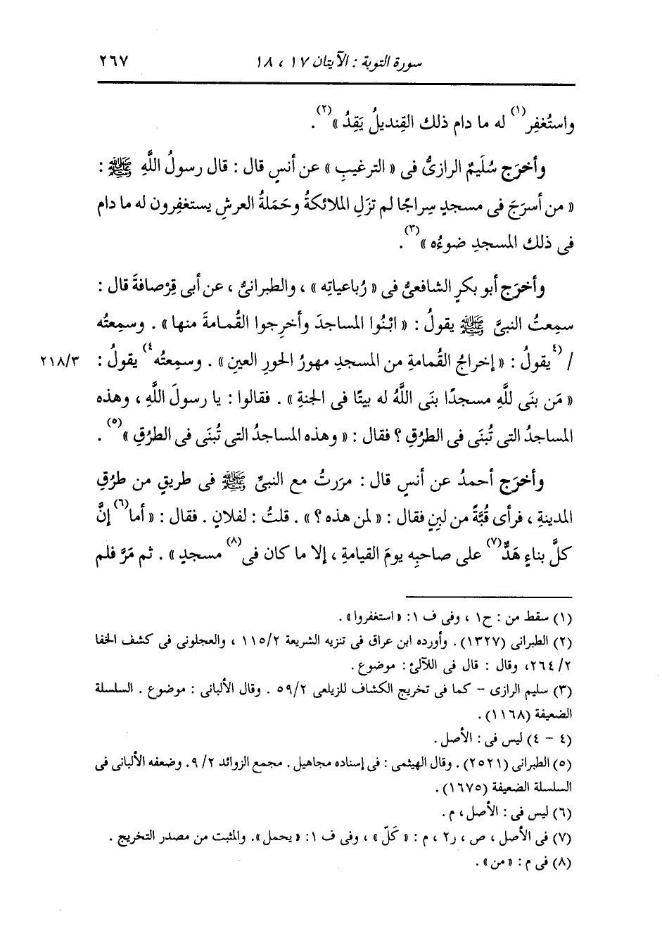 وأخرج الطبراني في مسند الشاميين عن علي بن أبي طالب رضي الله عنه عن النَّبِيّ صلى الله عليه وسلم قال من علق قنديلا في مسجد صلى عليه سبعون ألف ملك