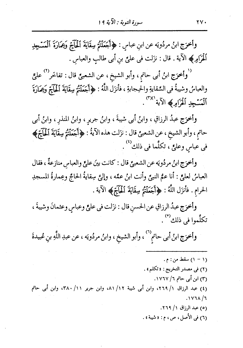 وأخرج ابن أبي حاتم ، وَابن مردويه عن ابن عباس رضي الله عنهما في قوله {أجعلتم سقاية الحاج} الآية ، وذلك أن المشركين قالوا : عمارة بيت الله وقيام على السقاية خير ممن آمن وجاهد ، فكانوا يفخرون بالحرم ويستكبرون به من أجل أنهم أهله وعماره فذكر الله استكبارهم وإعراضهم فقال لأهل الحرم من المشركين (قد كانت آياتي تتلى عليكم فكنتم على أعقابكم تنكصون ، مستكبرين به سامرا تهجرون) (المؤمنون الآية 67) ، يعني أنهم كانوا يستكبرون بالحرم ، وقال (به سامرا) كانوا به يسمرون ويهجون بالقرآن والنبي صلى الله عليه وسلم فخير الإيمان بالله والجهاد مع نبي الله صلى الله عليه وسلم على عمران المشركين البيت وقيامهم على السقاية ولم يكن ينفعهم عند الله تعالى مع الشرك به وإن كانوا يعمرون بيته ويخدمونه قال الله {لا يستوون عند الله والله لا يهدي القوم الظالمين} يعني الذين زعموا أنهم أهل العمارة فسماهم الله ظالمين بشركهم فلم تغن عنهم العمارة شيئا ، وأخرح ابن جرير ، وَابن المنذر ، وَابن أبي حاتم عن ابن عباس رضي الله عنهما قال : قال العباس رضي الله عنه حين أسر يوم بدر : إن كنتم سبقتمونا بالإسلام والهجرة والجهاد لقد كنت نعمر المسجد الحرام ونسقي الحاج ونفك العاني فأنزل الله {أجعلتم سقاية الحاج} الآية ، يعني أن ذلك كان في الشرك فلا أقبل ما كان في الشرك