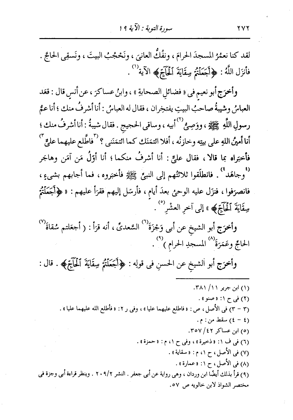 وأخرج ابن جرير عن محمد بن كعب القرظي رضي الله عنه قال : افتخر طلحة بن شيبة والعباس وعلي بن أبي طالب فقال طلحة : أنا صاحب البيت معي مفتاحه ، وقال العباس رضي الله عنه : أنا صاحب السقاية والقائم عليها : فقال علي رضي الله عنه : ما أدري ما تقولون : لقد صليت إلى القبلة قبل الناس وأنا صاحب الجهاد فأنزل الله {أجعلتم سقاية الحاج} الآية كلها.