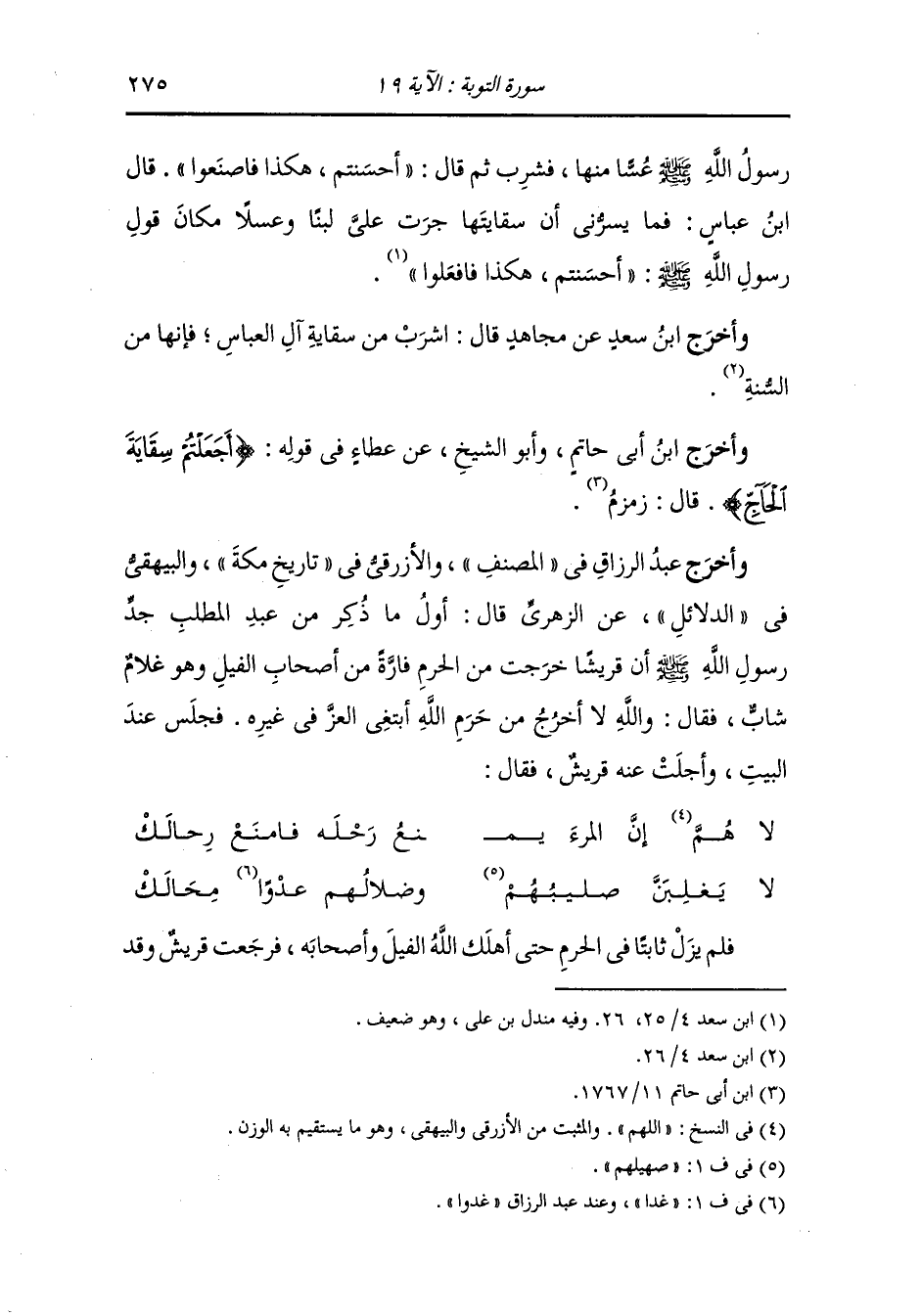 وَأخرَج ابن سعد عن مجاهد قال : طاف رسول الله صلى الله عليه وسلم على ناقته بالبيت معه محجن يستلم به الحجر كلما مر عليه ثم آتى السقاية يستسقي فقال العباس : يارسول الله ، ألا نأتيك بماء لم تمسه الأيدي قال : بلى فاسقوني فسقوه ثم أتى زمزم فقال : استقوا لي منها دلوا فأخرجوا منها دلوا فمضمض منه ثم مجه فيه ثم قال : أعيدوه ثم قال : إنكم على عمل صالح ثم قال : لولا أن تغلبوا عليه لنزلت فنزعت معكم.