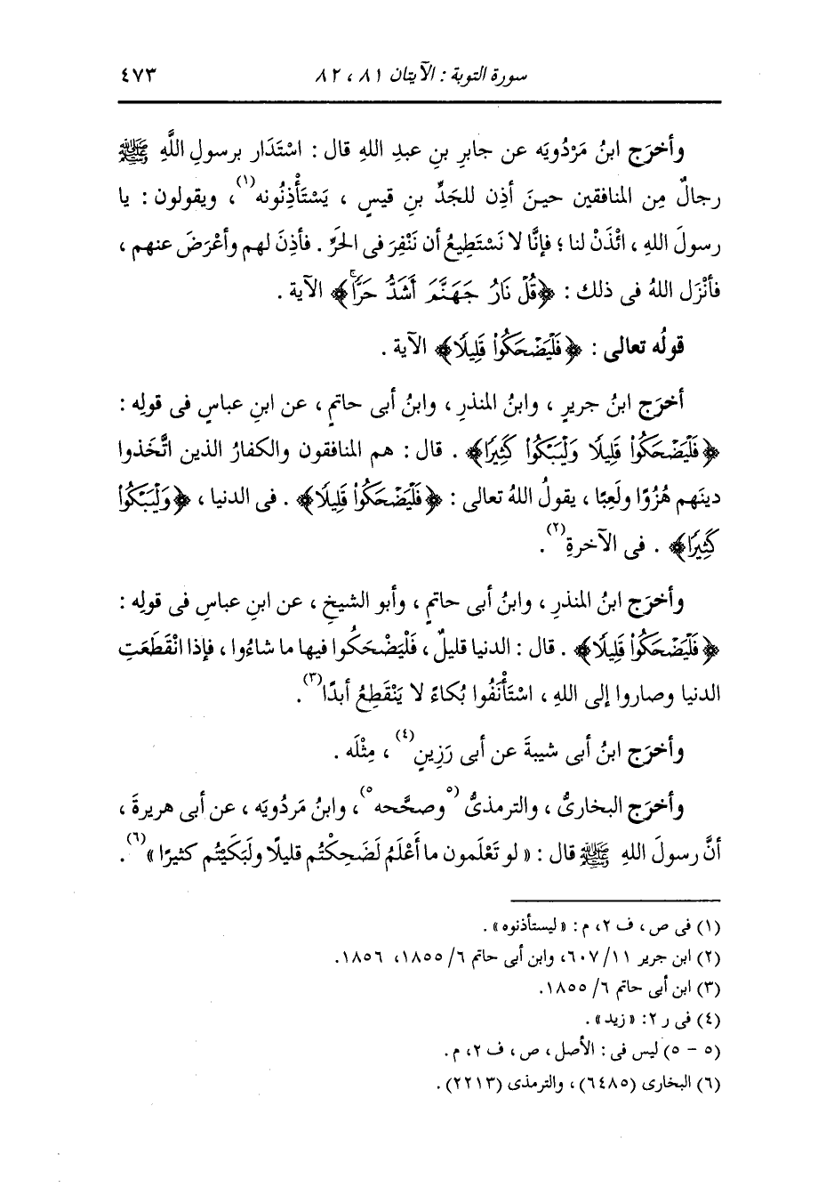 أَخْرَج ابن جرير ، وَابن المنذر ، وَابن أبي حاتم عن ابن عباس رضي الله عنهما في قوله {فليضحكوا قليلا وليبكوا كثيرا} قال : هم المنافقون والكفار الذين اتخذوا من دينهم هزوا ولعبا يقول الله تعالى {فليضحكوا قليلا} في الدنيا {وليبكوا كثيرا} في الآخرة.