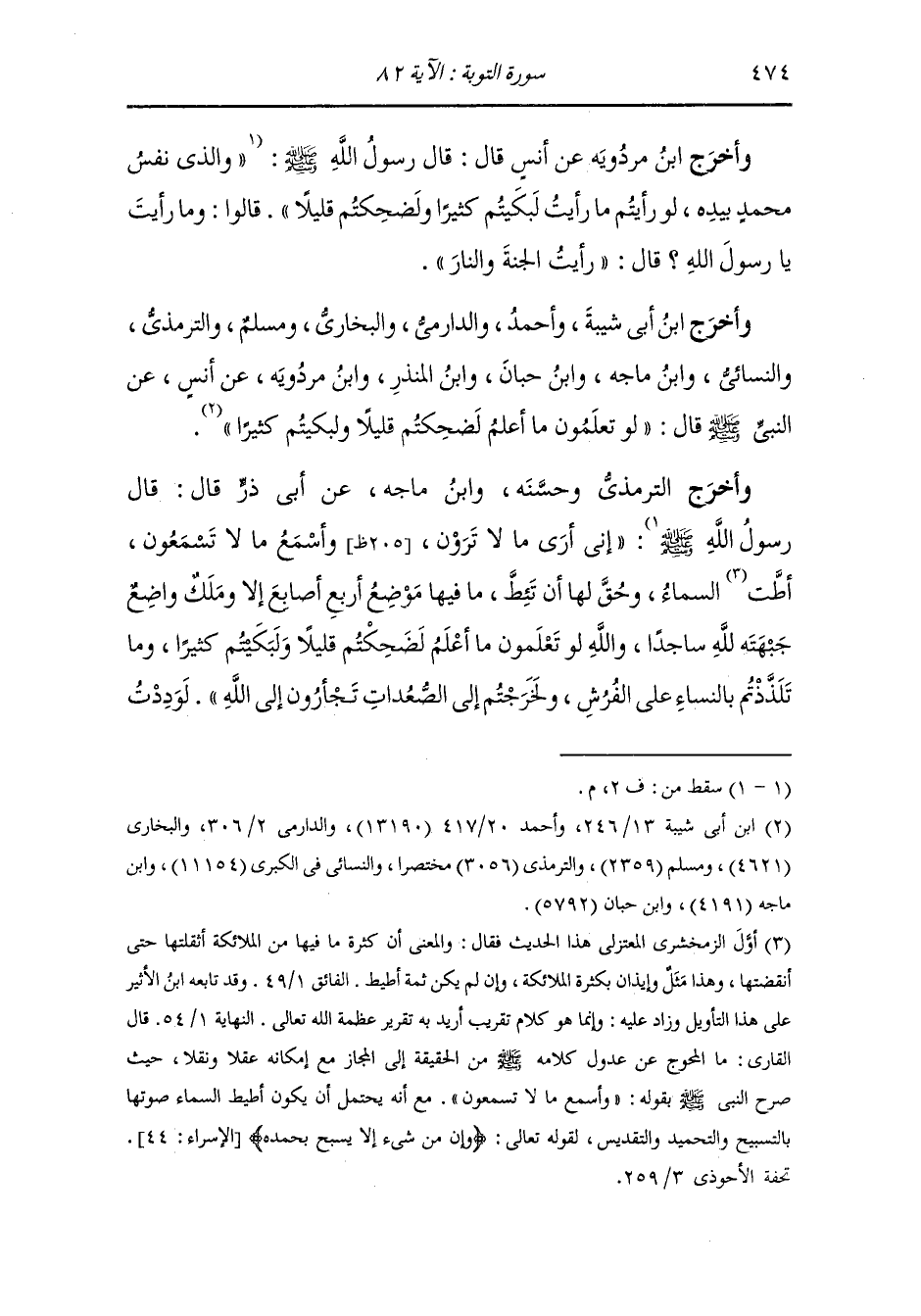 وأخرج ابن مردويه عن أنس قال : قال رسول الله صلى الله عليه وسلم إني أرى ما لا ترون وأسمع ما لا تسمعون أطت السماء وحق لها أن تئط ما فيها موضع أربع أصابع إلا وملك واضع جبهته لله ساجدا والله لو تعلمون ما أعلم لضحكتم قليلا ولبكيتم كثيرا وما تلذذتم بالنساء على الفرش ولخرجتم إلى الصعدات تجارون إلى الله لوددت
