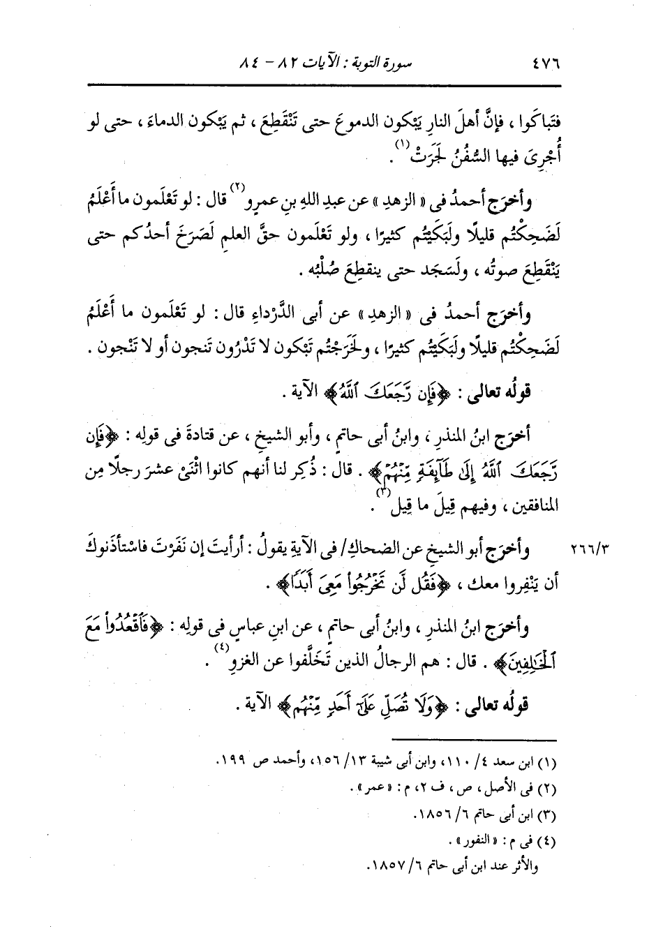 وأخرج أحمد في الزهد عن عبد الله بن عمر قال : لو تعلمون ما أعلم لضحكتم قليلا ولبكيتم كثيرا ولو تعلمون حق العلم لصرخ أحدكم حتى ينقطع صوته ولسجد حتى ينقطع صلبه.