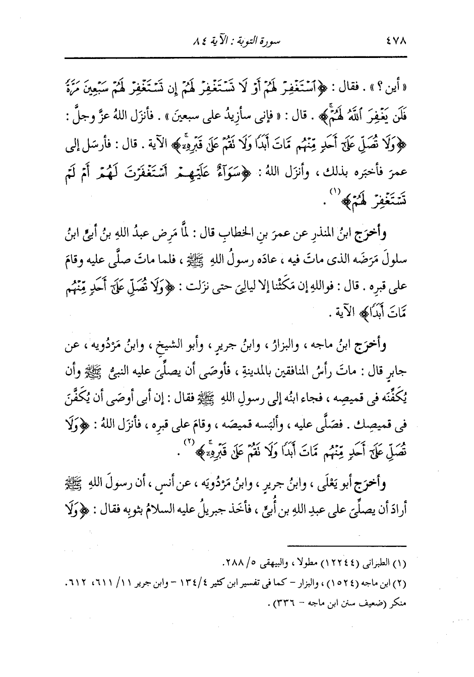 وابن فقال (استغفر لهم أو لا تستغفر لهم إن تستغفر لهم سبعين مرة فلن يغفر الله لهم) (التوبة الآية 80) قال : فإني سأزيد على سبعين ، فأنزل الله عز وجل {ولا تصل على أحد منهم مات أبدا ولا تقم على قبره} الآية ، قال : فأرسل إلى عمر فأخبره بذلك وأنزل الله (سواء عليهم استغفرت لهم أم لم تستغفر لهم) (المنافقون الآية 6).