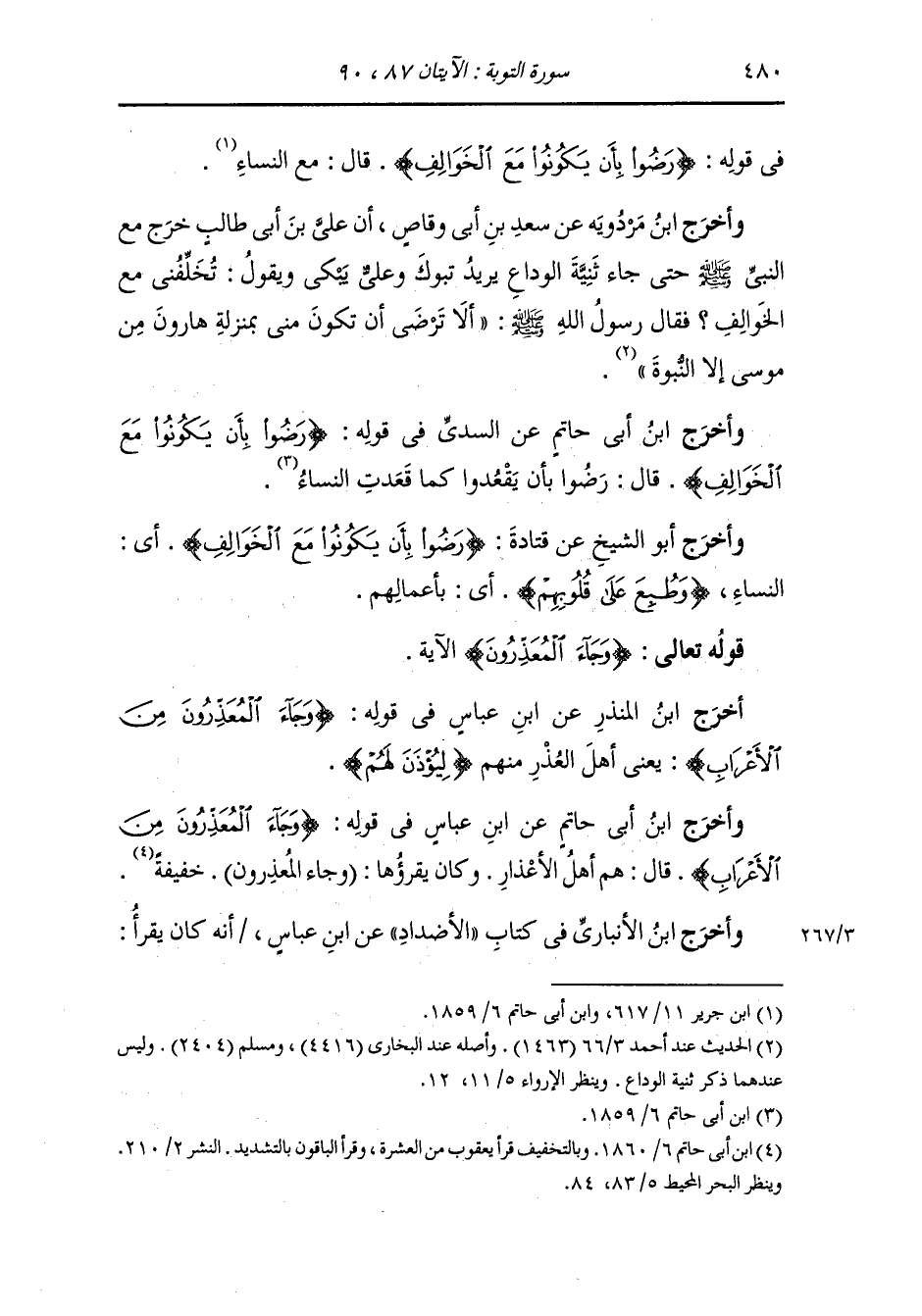 وأخرج ابن أبي حاتم عن ابن عباس في قوله {وجاء المعذرون من الأعراب} قال : هم أهل الأعذار وكان يقرؤها {وجاء المعذرون} خفيفة.