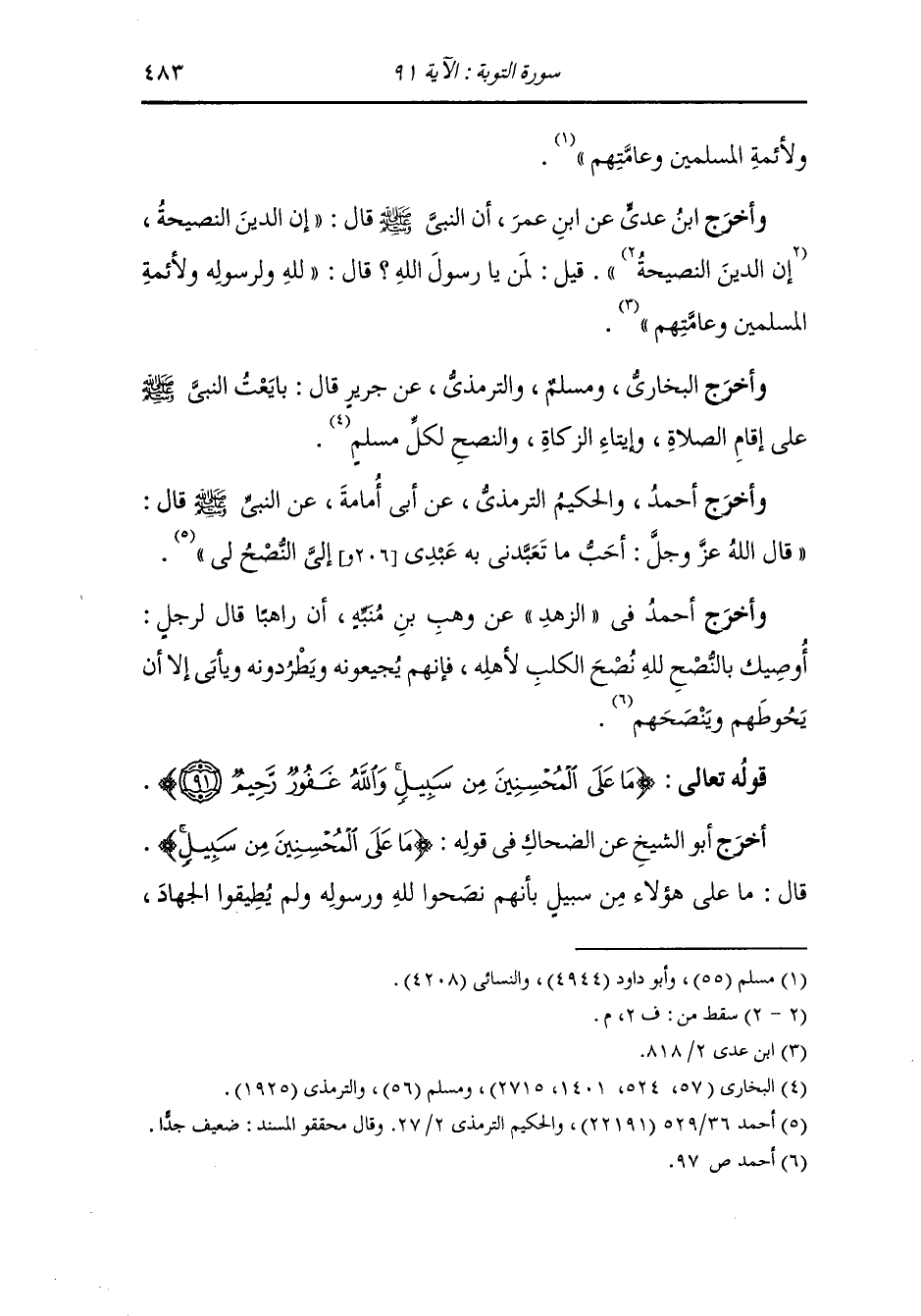 وأخرج ابن عدي عن ابن عمر أن رسول الله صلى الله عليه وسلم قال : إن الدين النصيحة ، قيل : لمن يا رسول الله قال : لله ولرسوله ولأئمة المسلمين وعامتهم.