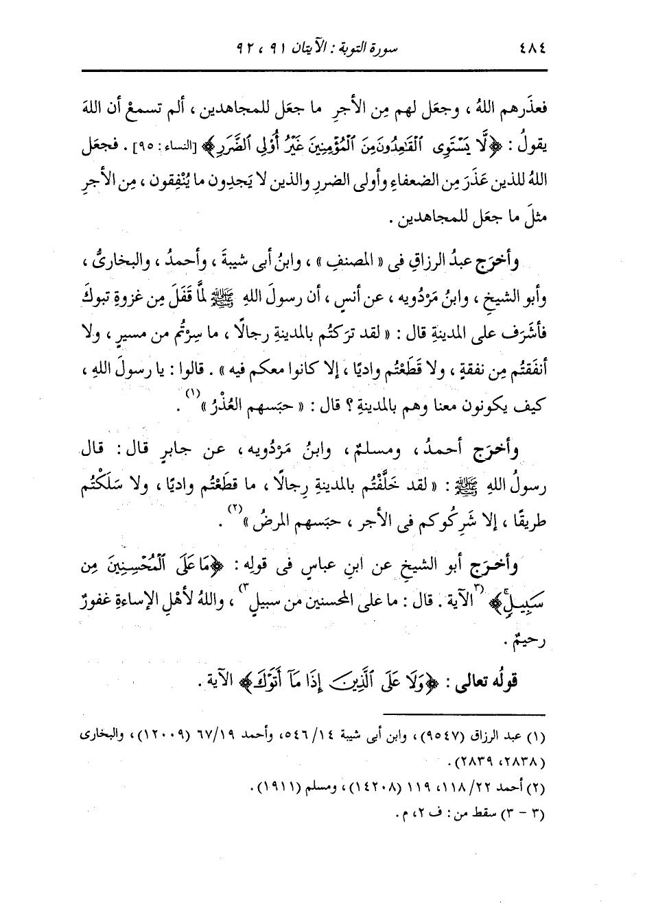 فعذرهم الله وجعل لهم من الأجر ما جعل للمجاهدين ألم تسمع أن الله يقول (لا يستوي القاعدون من المؤمنين غير أولي الضرر) (النساء الآية 95) فجعل الله للذين عذر من الضعفاء وأولي الضرر والذين لا يجدون ما ينفقون من الأجر مثل ما جعل للمجاهدين.