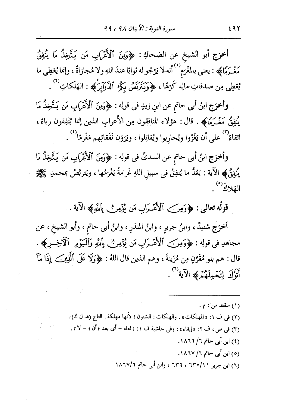 وأخرج ابن أبي حاتم عن ابن زيد في قوله {ومن الأعراب من يتخذ ما ينفق مغرما} قال : هؤلاء المنافقون من الأعراب الذين إنما ينفقون رياء اتقاء على أن يغزوا ويحاربوا ويقاتلوا ويرون نفقاتهم مغرما.