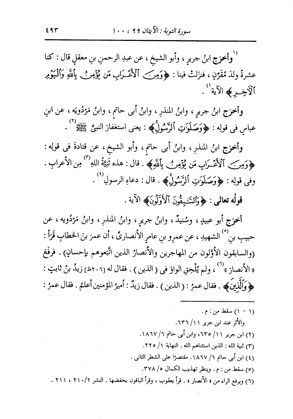 أَخرَج أبو عبيد وسنيد ، وَابن جَرِير ، وَابن المنذر ، وَابن مردويه عن حبيب الشهيد عن عمرو بن عامر الأنصاري ، أن عمر بن الخطاب قرأ والسابقون الأولون من المهاجرين والأنصار الذين اتبعوهم بإحسان فرفع الأنصار ولم يلحق الواو في الذين فقال له زيد بن ثابت : والذين ، فقال عمر : الذين ، فقال زيد : أمير المؤمنين أعلم ، فقال عمر رضي الله عنه :