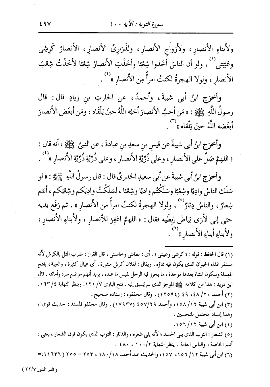 وأخرج ابن أبي شيبة عن أبي سعيد الخدري رضي الله عنه قال : قال رسول الله صلى الله عليه وسلم لو سلك الناس واديا وشعبا وسلكتم واديا وشعبا لسلكت واديكم وشعبكم أنتم شعار والناس دثار ولولا الهجرة لكنت إمرأ من الأنصار ثم رفع يديه حتى إني لأرى بياض إبطيه فقال : اللهم اغفر للأنصار ولأبناء الأنصار ولأبناء أبناء الأنصار