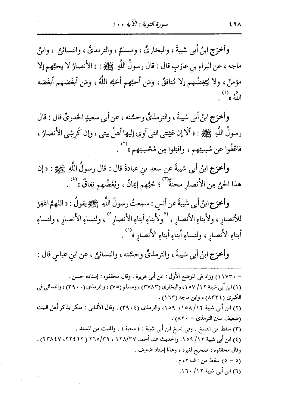 وأخرج ابن أبي شيبة والبخاري ومسلم والترمذي والنسائي ، وَابن ماجة عن البراء بن عازب رضي الله عنه قال : قال رسول الله صلى الله عليه وسلم الأنصار لا يحبهم إلا مؤمن ولا يبغضهم إلا منافق ومن أحبهم أحبه الله ومن أبغضهم أبغضه الله.