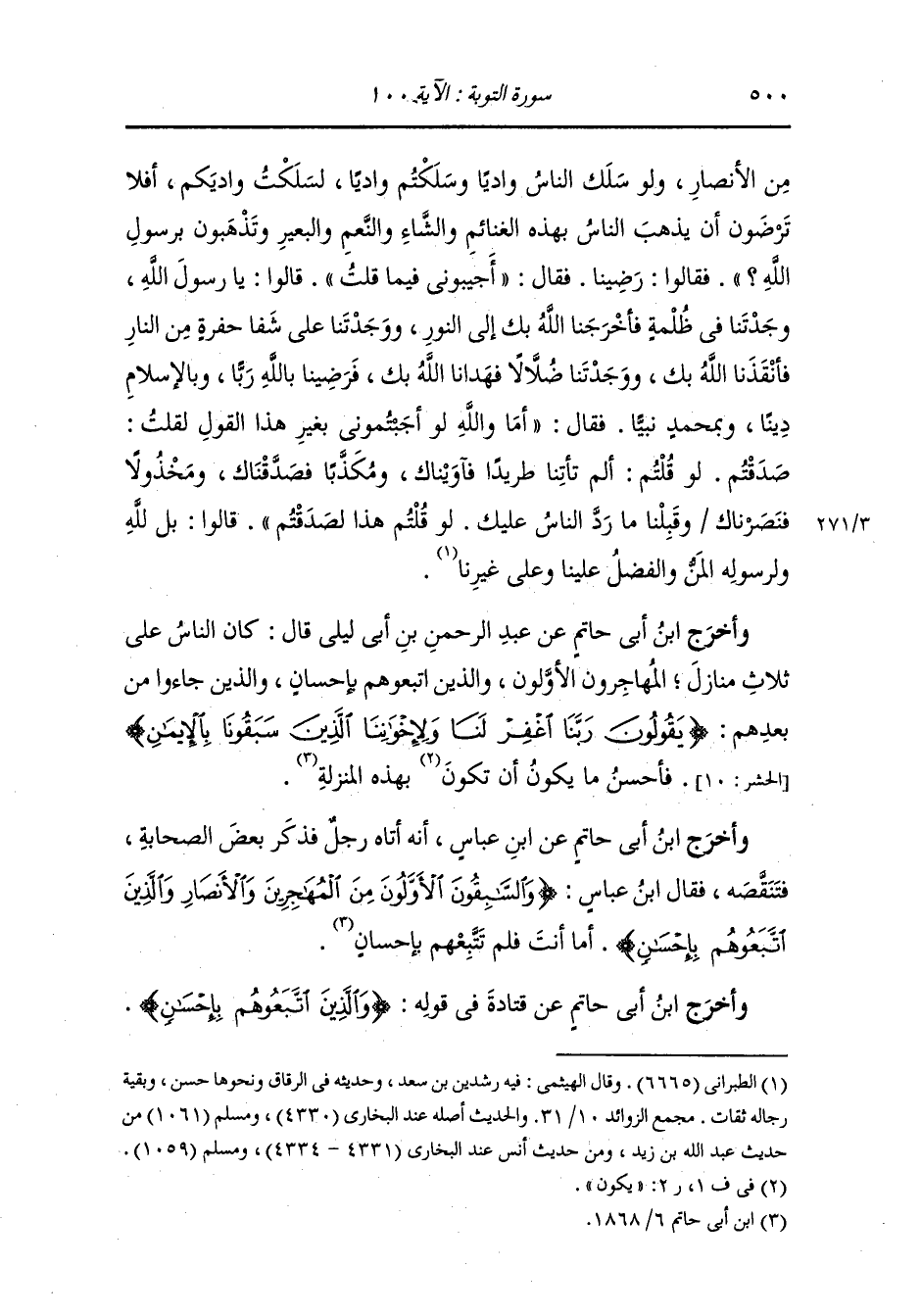 وأخرج ابن أبي حاتم عن ابن عباس رضي الله عنهما ، أنه أتاه رجل فذكر بعض الصحابة فتنقصه فقال ابن عباس {والسابقون الأولون من المهاجرين والأنصار والذين اتبعوهم بإحسان}