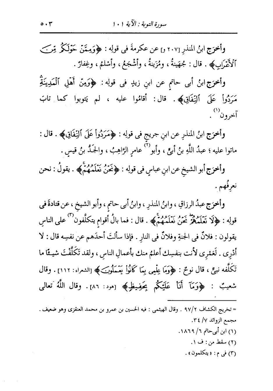 وأخرج ابن المنذر عن ابن جريج في قوله {مردوا على النفاق} قال : ماتوا عليه عبد الله بن أبي وأبو عامر الراهب والجد بن قيس.