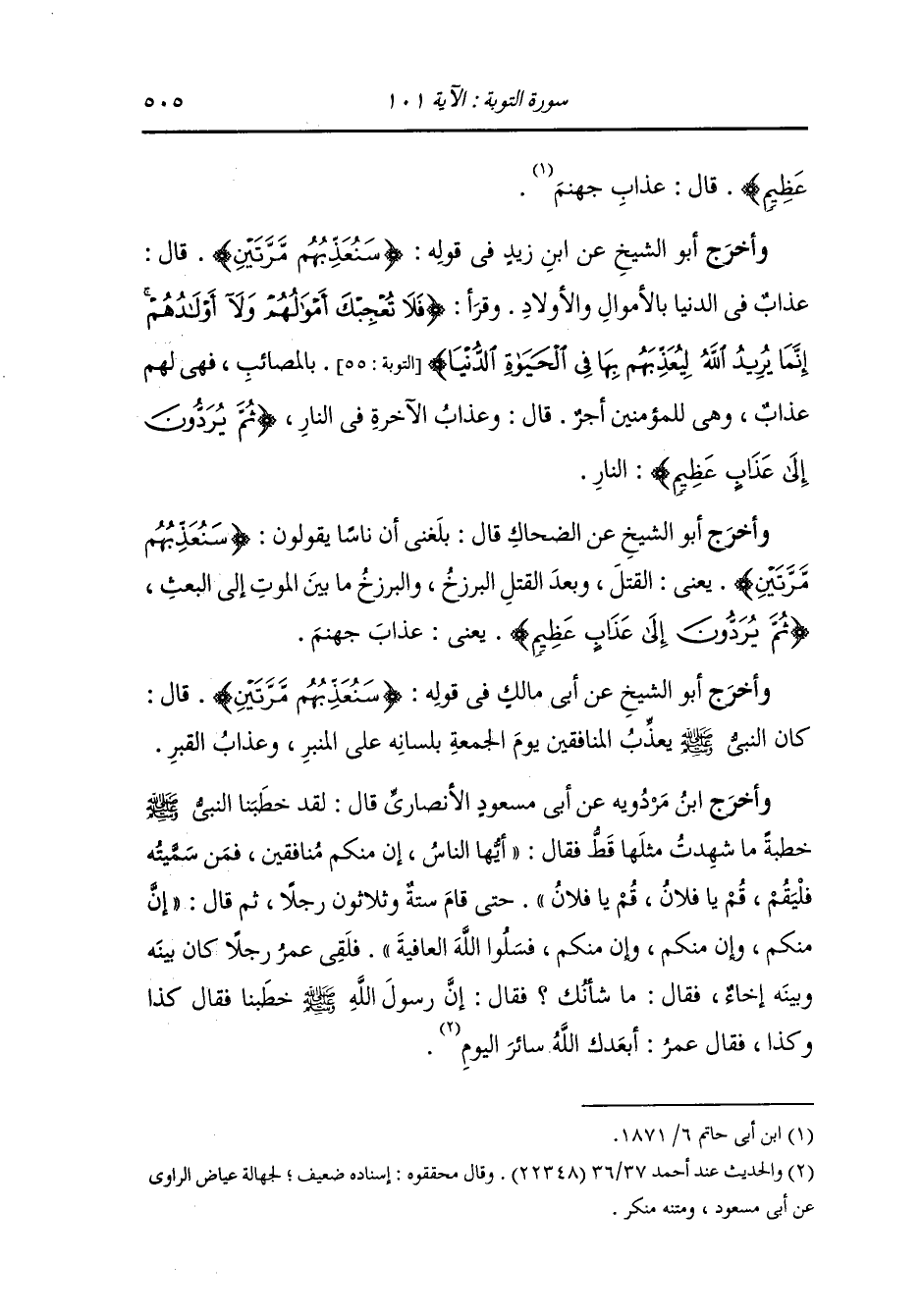 وأخرج أبو الشيخ عن ابن زيد رضي الله عنه في قوله {سنعذبهم مرتين} قال : عذاب في الدنيا بالأموال والأولاد وقرأ (فلا تعجبك أموالهم ولا أولادهم إنما يريد الله ليعذبهم بها في الحياة الدنيا) (التوبة الآية 55) بالمصائب فهي لهم عذاب وهي للمؤمنين أجر ، قال : وعذاب الآخرة في النار {ثم يردون إلى عذاب عظيم} النار.