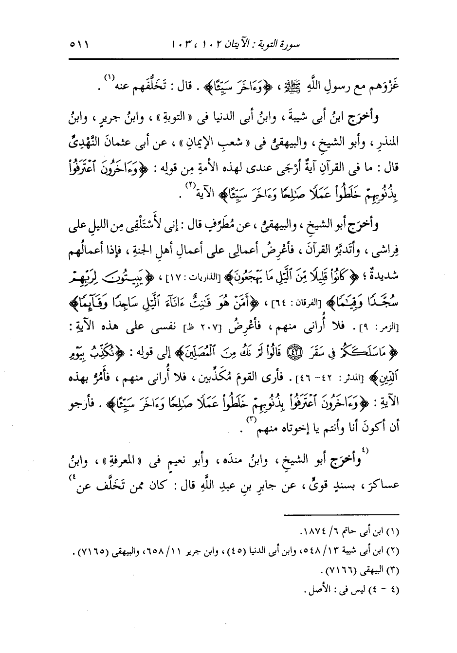 وأخرج أبو الشيخ والبيهقي عن مطرف قال : إني لأستلقي من الليل على فراشي وأتدبر القرآن فأعرض أعمالي على أعمال أهل الجنة فإذا أعمالهم شديدة (كانوا قليلا من الليل ما يهجعون) (الذاريات الآية 17) ، (يبيتون لربهم سجدا وقياما) (الفرقان الآية 64) ، (أمن هو قانت آناء الليل ساجدا وقائما) (الزمر الآية 9) فلا أراني منهم ، فأعرض نفسي على هذه الآية (ما سلككم في سقر) (قالوا لم نك من المصلين) (المدثر الآية 42 - 46) إلى قوله (نكذب بيوم الدين) فأرى القوم مكذبين فلا أراني منهم فأمر بهذه الآية {وآخرون اعترفوا بذنوبهم خلطوا عملا صالحا وآخر سيئا} فأرجو أن أكون أنا وأنتم يا إخوتاه منهم.