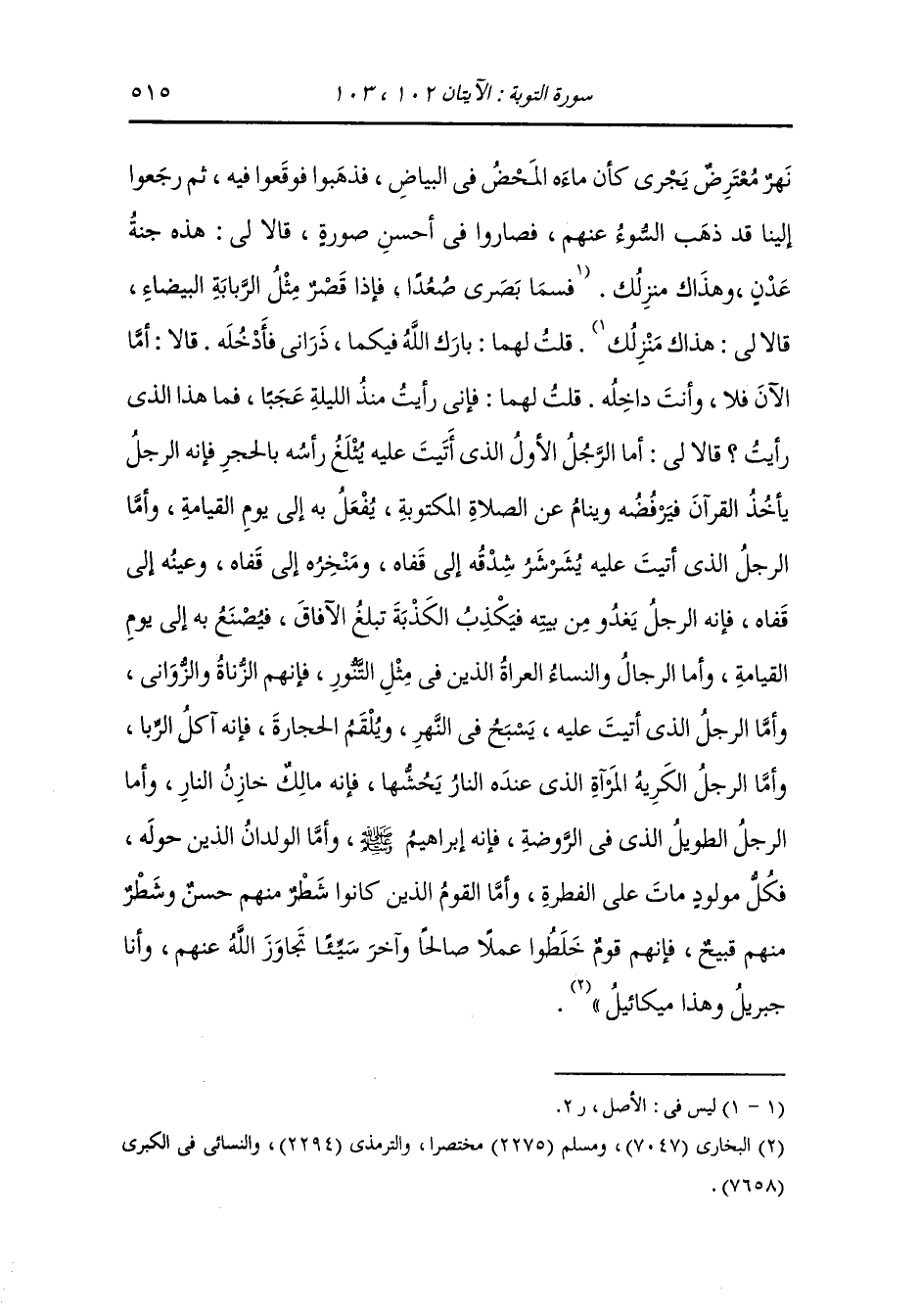 نهر معترض يجري كأن ماءه المخض في البياض فذهبوا فوقعوا فيه ثم رجعوا إلينا فذهب السوء عنهم فصاروا في أحسن صورة ، قالا لي : هذه جنة عدن وهذاك منزلك فسما بصري صعدا فإذا قصر مثل الربابة البيضاء قالا لي : هذا منزلك ، قلت لهما : بارك الله فيكما ذراني فأدخله ، قالا : أما الآن فلا وأنت داخله ، قلت لهما : فإني رأيت منذ الليلة عجبا فما هذا الذي رأيت قالا لي : أما الرجل الأول الذي أتيت عليه يثلغ رأسه بالحجر فإنه الرجل يأخذ القرآن فيرفضه وينام عن الصلاة المكتوبة يفعل به إلى يوم القيامة.