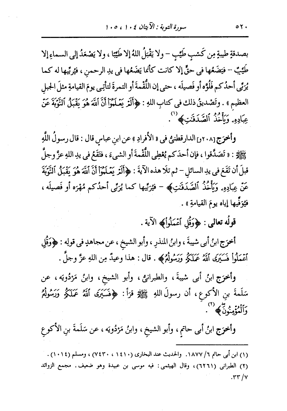 وأخرج الدارقطني في الأفراد عن ابن عباس قال : قال رسول الله صلى الله عليه وسلم تصدقوا فإن أحدكم يعطي اللقمة أو الشيء فتقع في يد الله عز وجل قبل أن تقع في يد السائل ثم تلا هذه الآية {ألم يعلموا أن الله هو يقبل التوبة عن عباده ويأخذ الصدقات} فيربيها كما يربي أحدكم مهره أو فصيله فيوفيها إياه يوم القيامة.