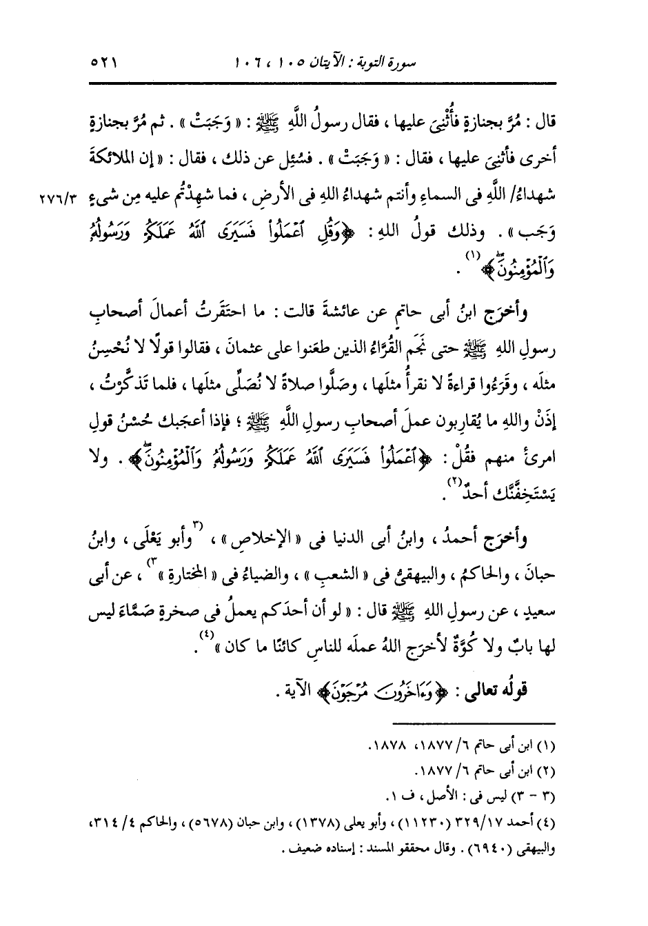 وأخرج ابن أبي حاتم عن عائشة قالت : ما احتقرت أعمال أصحاب رسول الله صلى الله عليه وسلم حتى نجم القراء الذين طعنوا على عثمان فقالوا قولا لا نحسن مثله وقرأوا قراءة لا نقرأ مثلها وصلوا صلاة لا نصلي مثلها فلما تذكرت إذن والله ما يقاربون عمل أصحاب رسول الله صلى الله عليه وسلم فإذا أعجبك حسن قول إمرئ منهم {وقل اعملوا فسيرى الله عملكم ورسوله والمؤمنون} ولا يستخفنك أحد.
