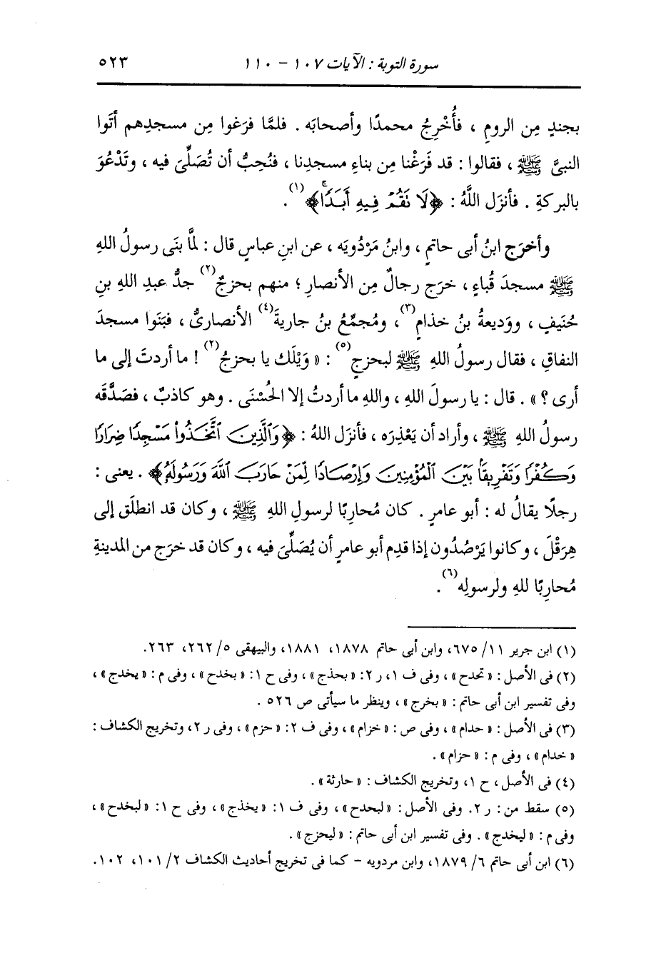 وأخرج ابن أبي حاتم ، وَابن مردويه عن ابن عباس قال : لما بنى رسول الله صلى الله عليه وسلم مسجد قباء خرج رجال من الأنصار منهم يخدج جد عبد الله بن حنيف ووديعة بن حزام ومجمع بن جارية الأنصاري فبنوا مسجد النفاق فقال رسول الله صلى الله عليه وسلم ليخدج ويلك يا يخدج ، ما أردت إلى ما أرى قال : يا رسول الله والله ما أردت إلا الحسنى - وهو كاذب - فصدقه رسول الله صلى الله عليه وسلم وأراد أن يعذره فأنزل الله {والذين اتخذوا مسجدا ضرارا وكفرا وتفريقا بين المؤمنين وإرصادا لمن حارب الله ورسوله} يعني رجلا يقال له أبو عامر كان محاربا لرسول الله صلى الله عليه وسلم وكان قد انطلق إلى هرقل وكانوا يرصدون إذا قدم أبو عامر أن يصلي فيه وكان قد خرج من المدينة محاربا لله ولرسوله