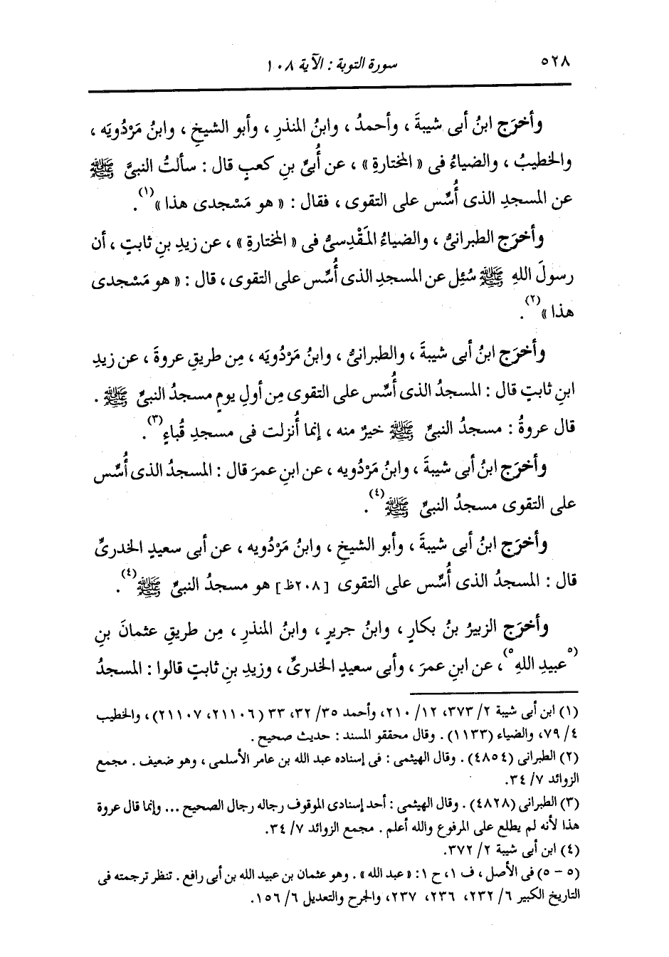وأخرج ابن أبي شيبة ، وَابن مردويه والطبراني من طريق عروة عن زيد بن ثابت قال : المسجد الذي أسس على التقوى من أول يوم مسجد النَّبِيّ صلى الله عليه وسلم ، قال عروة : مسجد النَّبِيّ صلى الله عليه وسلم خير منه إنما أنزلت في مسجد قباء.