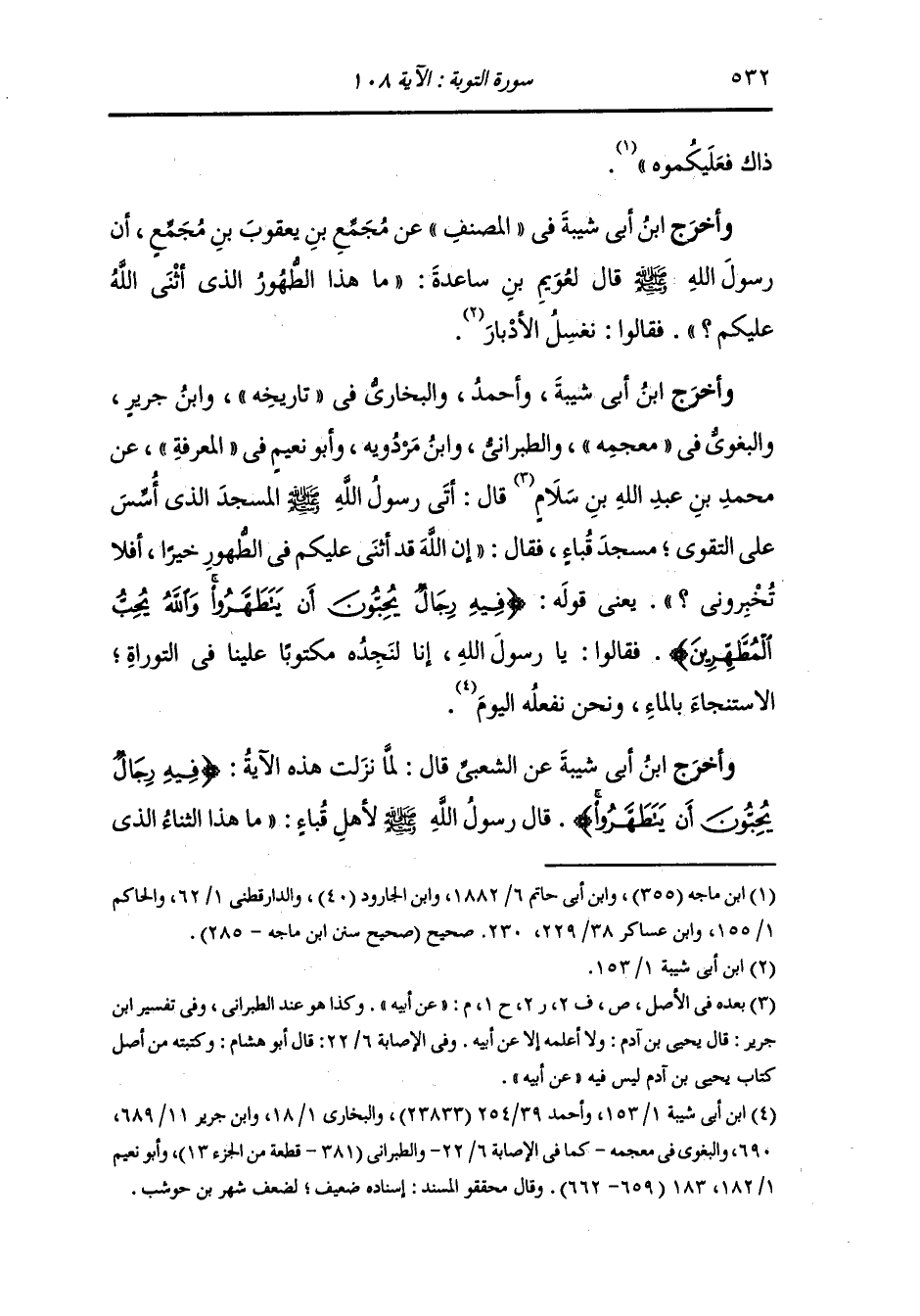وأخرج ابن أبي شيبة وأحمد والبخاري في تاريخه ، وَابن جَرِير والبغوي في معجمه والطبراني ، وَابن مردويه وأبو نعيم في المعرفة عن محمد بن عبد الله بن سلام عن أبيه قال : لما أتى رسول الله صلى الله عليه وسلم المسجد الذي أسس على التقوى فقال إن الله قد أثنى عليكم في الطهور خيرا أفلا تخبروني يعني قوله {فيه رجال يحبون أن يتطهروا والله يحب المطهرين}