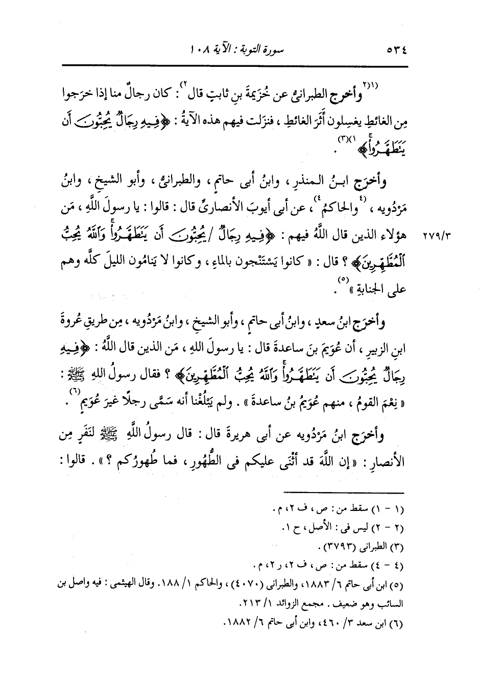 وأخرج ابن جرير ، وَابن مردويه عن خزيمة بن ثابت قال : كان رجال منا إذا خرجوا من الغائط يغسلون أثر الغائط فنزلت فيهم هذه الآية {فيه رجال يحبون أن يتطهروا}.