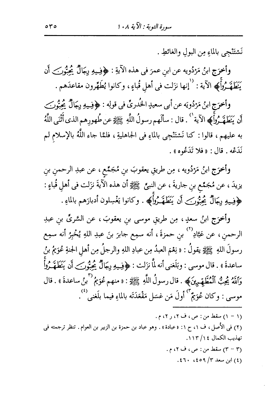 وأخرج ابن مردويه عن ابن عمر في هذه الآية {فيه رجال يحبون أن يتطهروا} الآية ، قال سألهم رسول الله صلى الله عليه وسلم عن طهورهم الذي أثنى الله به عليهم ، قالوا : كنا نستنجي بالماء في الجاهلية فلما جاء الله بالإسلام لم ندعه ، قال : فلا تدعوه.