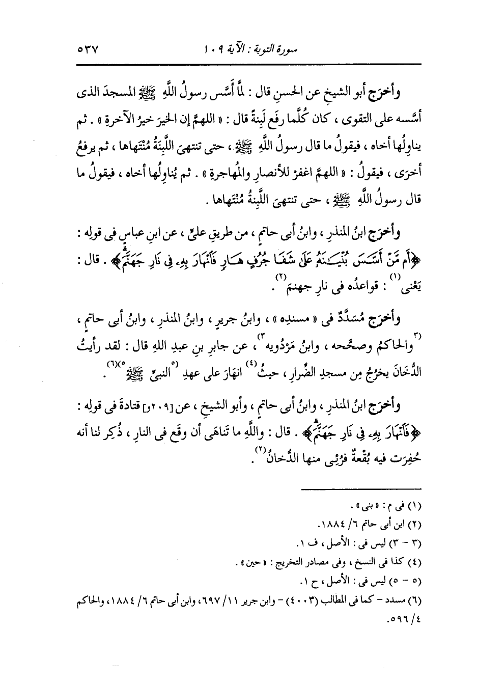 وأخرج مسدد في مسنده ، وَابن جَرِير ، وَابن المنذر ، وَابن أبي حاتم والحاكم وصححه ، وَابن مردويه ، عَن جَابر بن عبد الله قال : لقد رأيت الدخان يخرج من مسجد الضرار حيث انهار على عهد رسول الله صلى الله عليه وسلم.